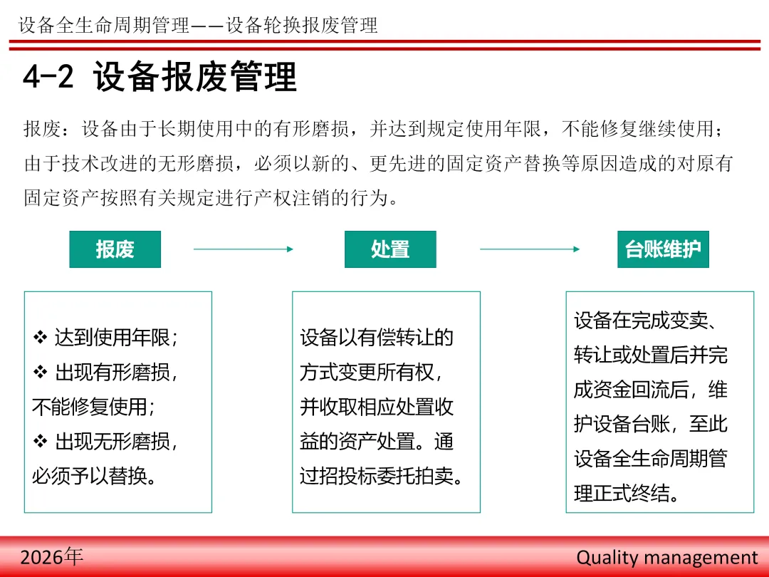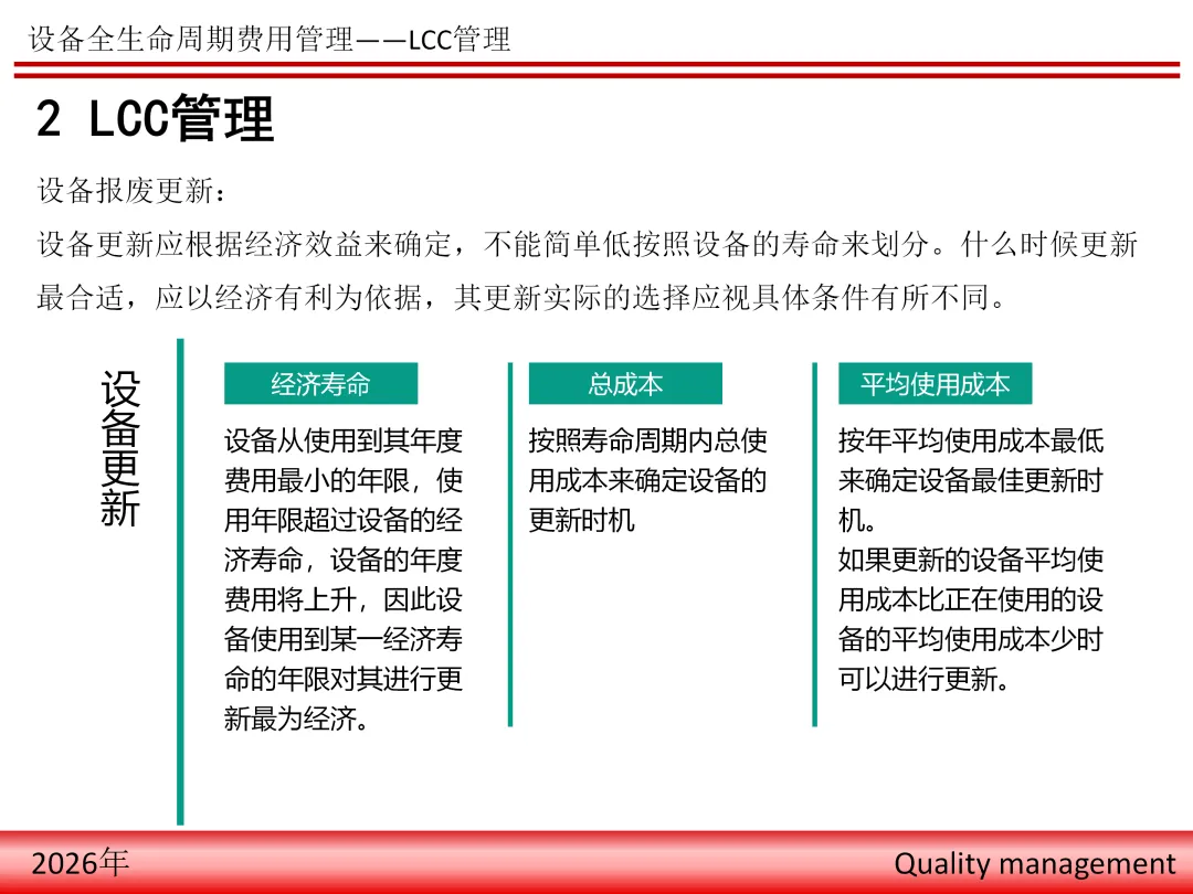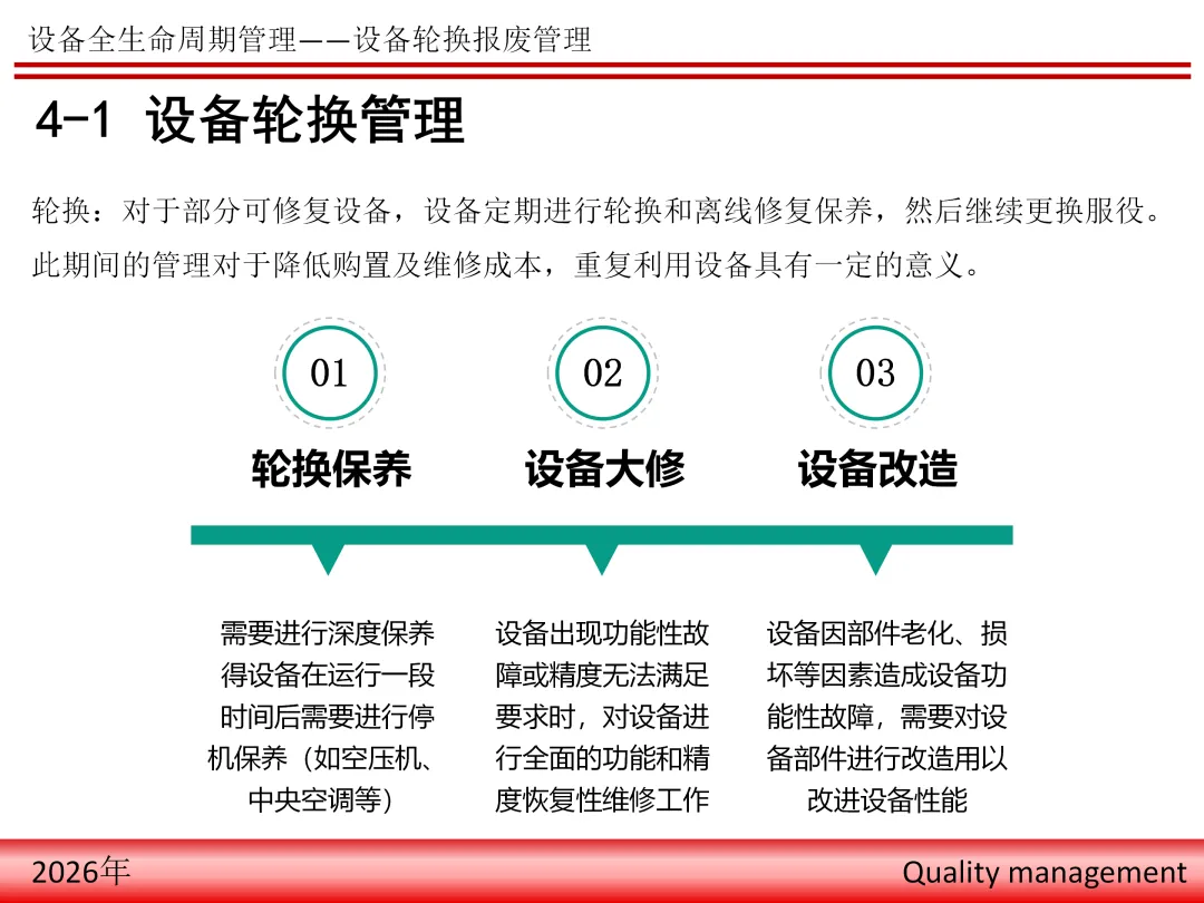 后期,则要根据经济性去判断是继续使用、轮换、大修、改造,还是更新、报废、再制造,而不是简单按年限拍脑袋决定。