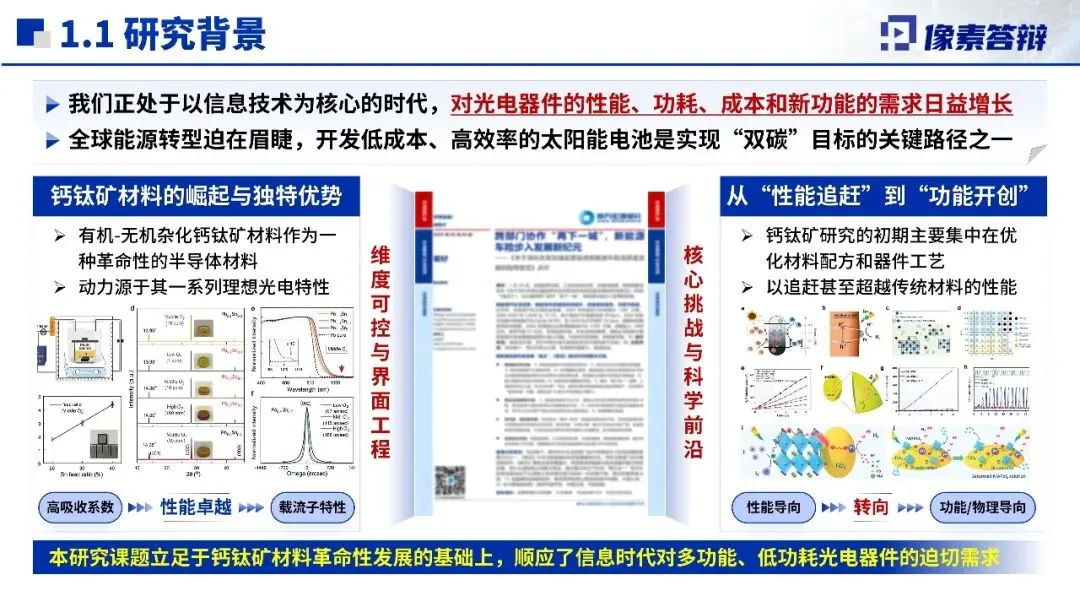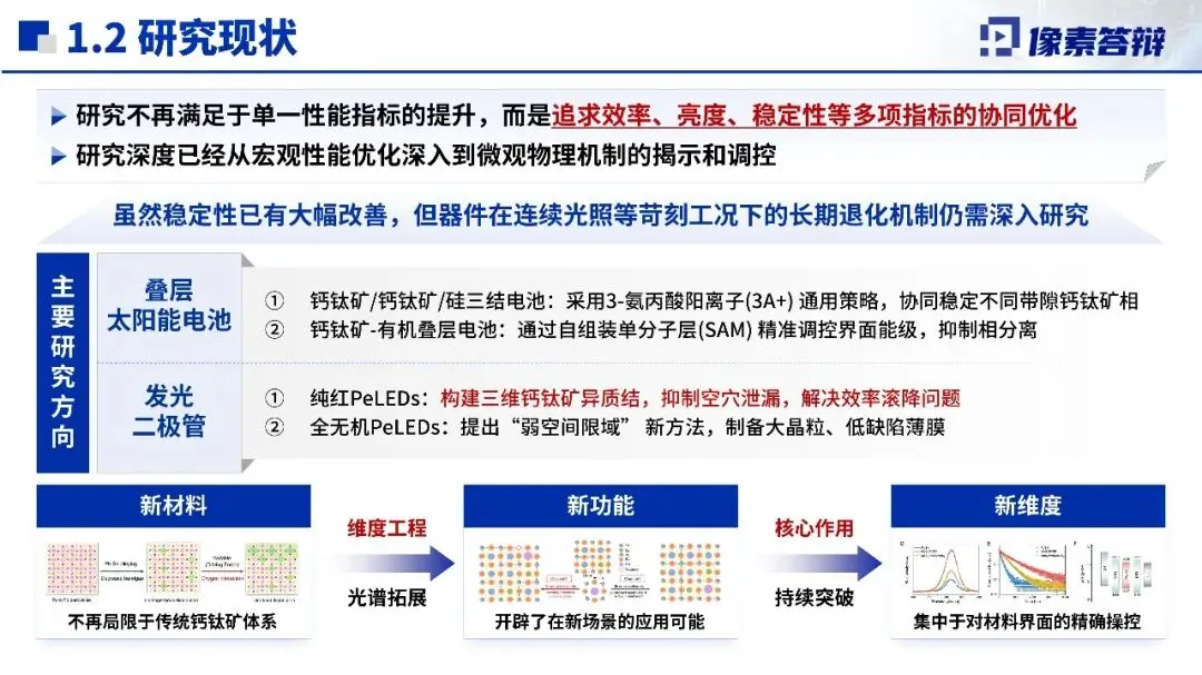 项目背景与研究现状贴合时代需求与学科前沿,信息技术发展和“双碳”目标对光电器件提出更高要求,钙钛矿材料成为研究热点。现有研究已从单一性能优化转向多指标协同提升,从宏观工艺改进深入到微观机制调控,在叠层电池、发光二极管等方向取得突破,但器件长期退化机制、离子迁移调控等核心问题仍待解决,明确了项目研究的方向与突破口。
