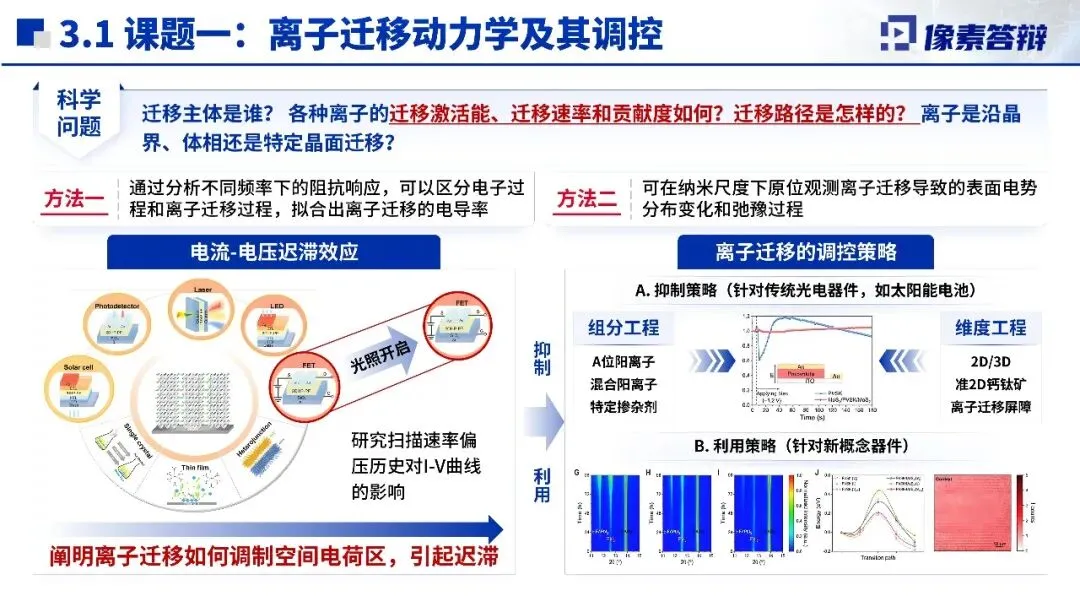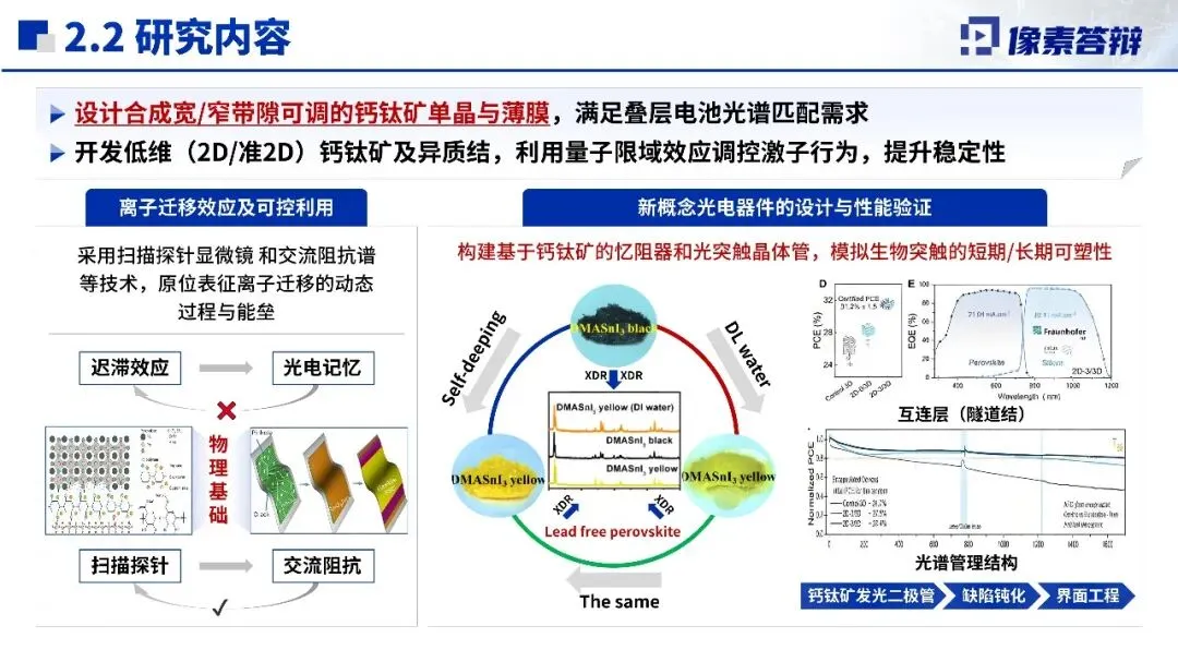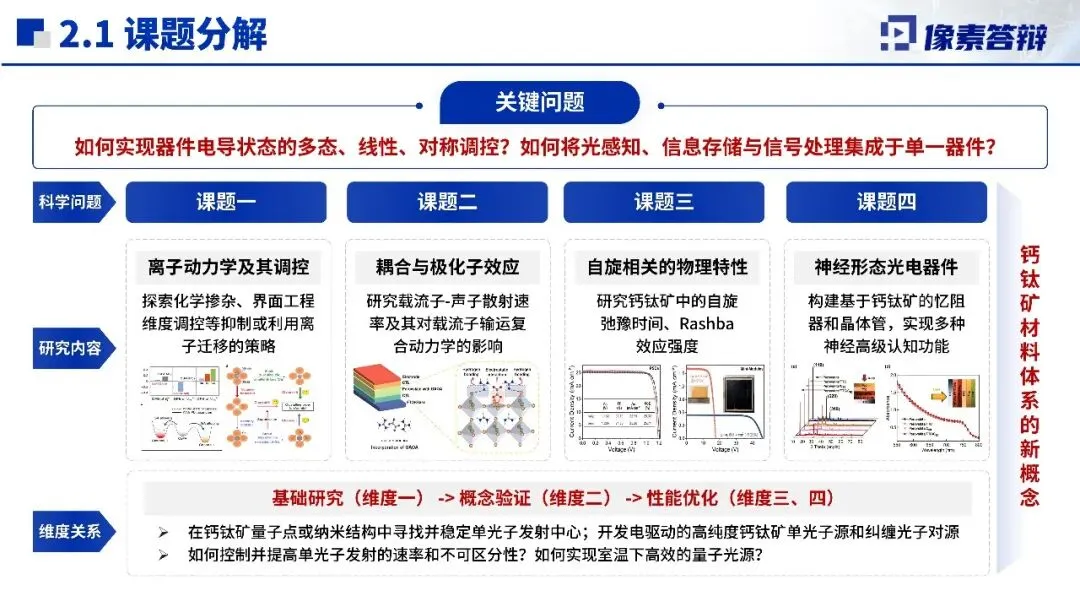 课题分解与研究内容是项目核心,拆解为四大核心课题,从离子迁移动力学到神经形态光电器件层层递进,实现从基础物理机制研究到器件设计验证的衔接。研究聚焦钙钛矿关键科学问题,结合组分、维度工程等技术手段,通过原位表征、理论计算等方法调控材料特性,设计合成新型钙钛矿材料,构建忆阻器等新概念器件,形成“基础研究-概念验证-性能优化”完整研究链条。