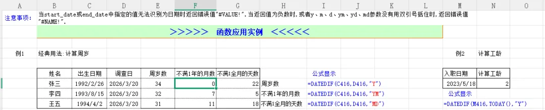 注意事项:当start_date或end_date中指定的值无法识别为日期时,返回错误值"#VALUE!"。当返回值为负数时,或者y、m、d、ym、yd、md参数没有用双引号括住时,返回错误值"#NAME!"。