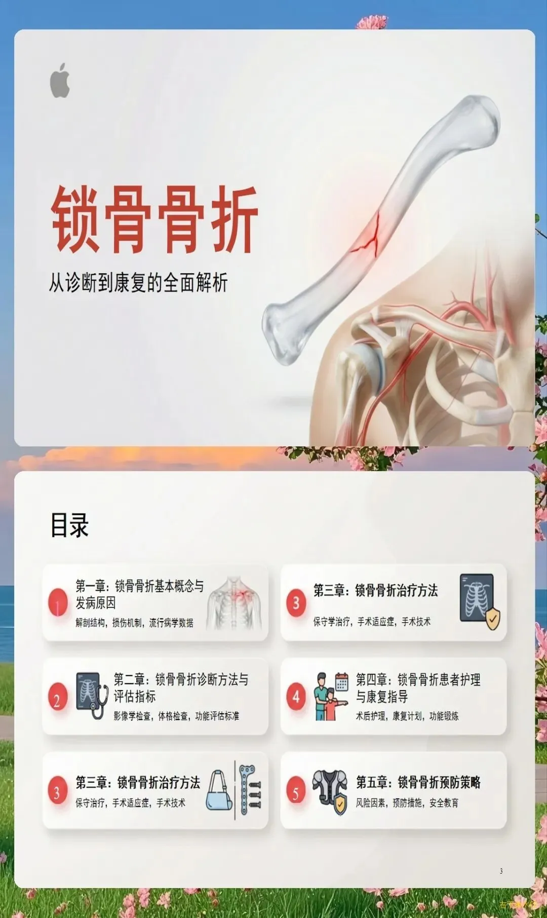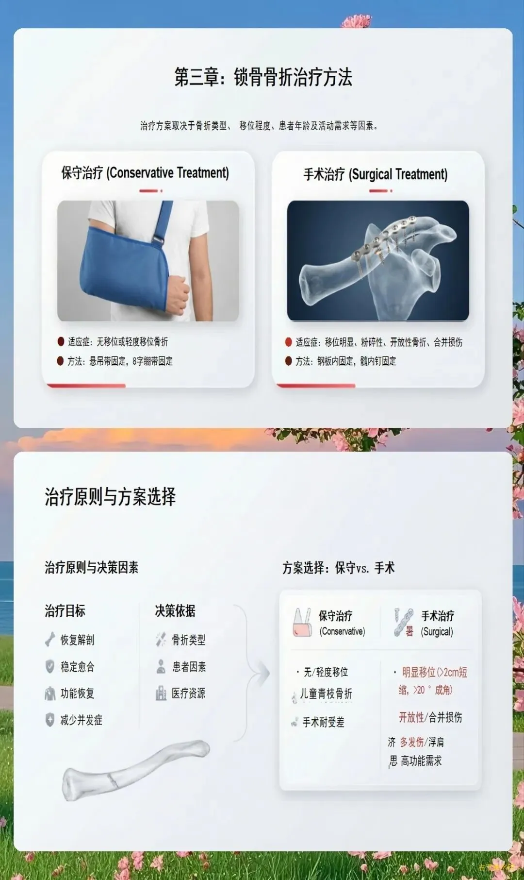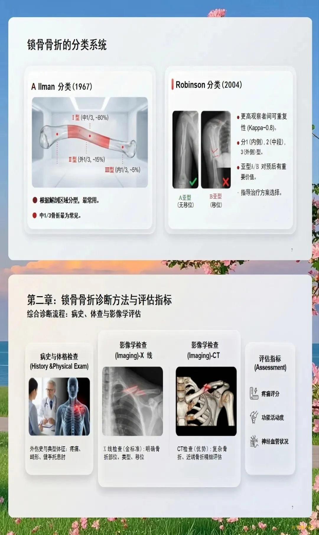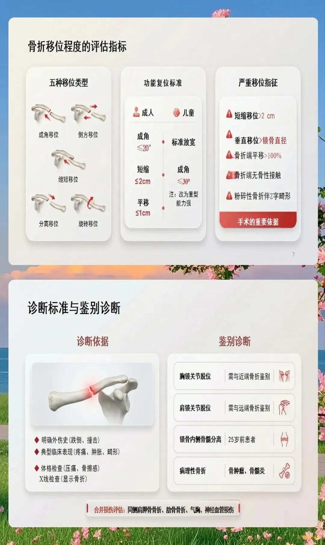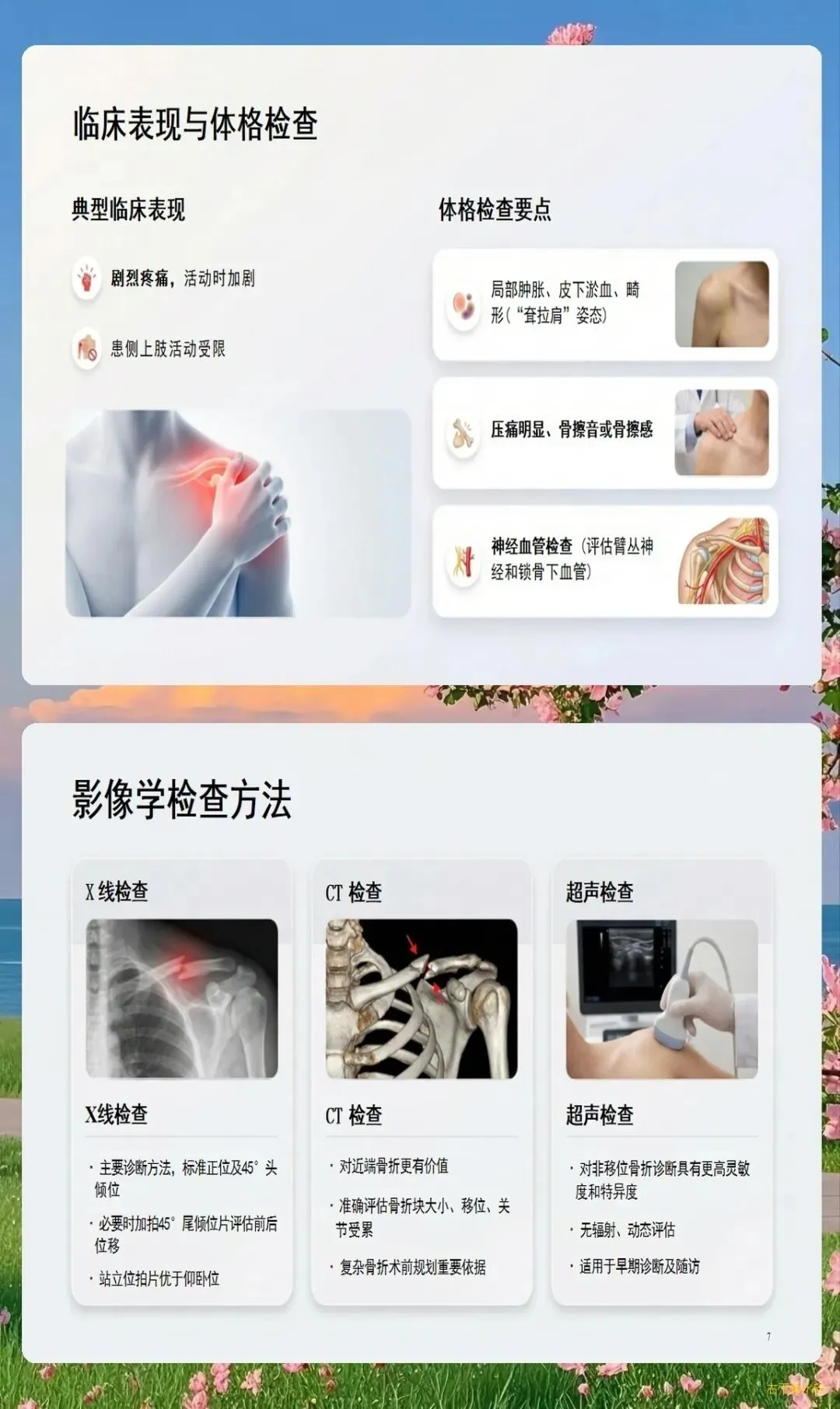 临床典型表现为患肩下沉、前倾,头偏向患侧,健侧手托住患侧肘部以减轻疼痛。局部肿胀、瘀斑、压痛明显,可触及骨擦感和异常活动。X线检查可明确骨折类型、移位程度,必要时需行CT三维重建评估骨折细节。