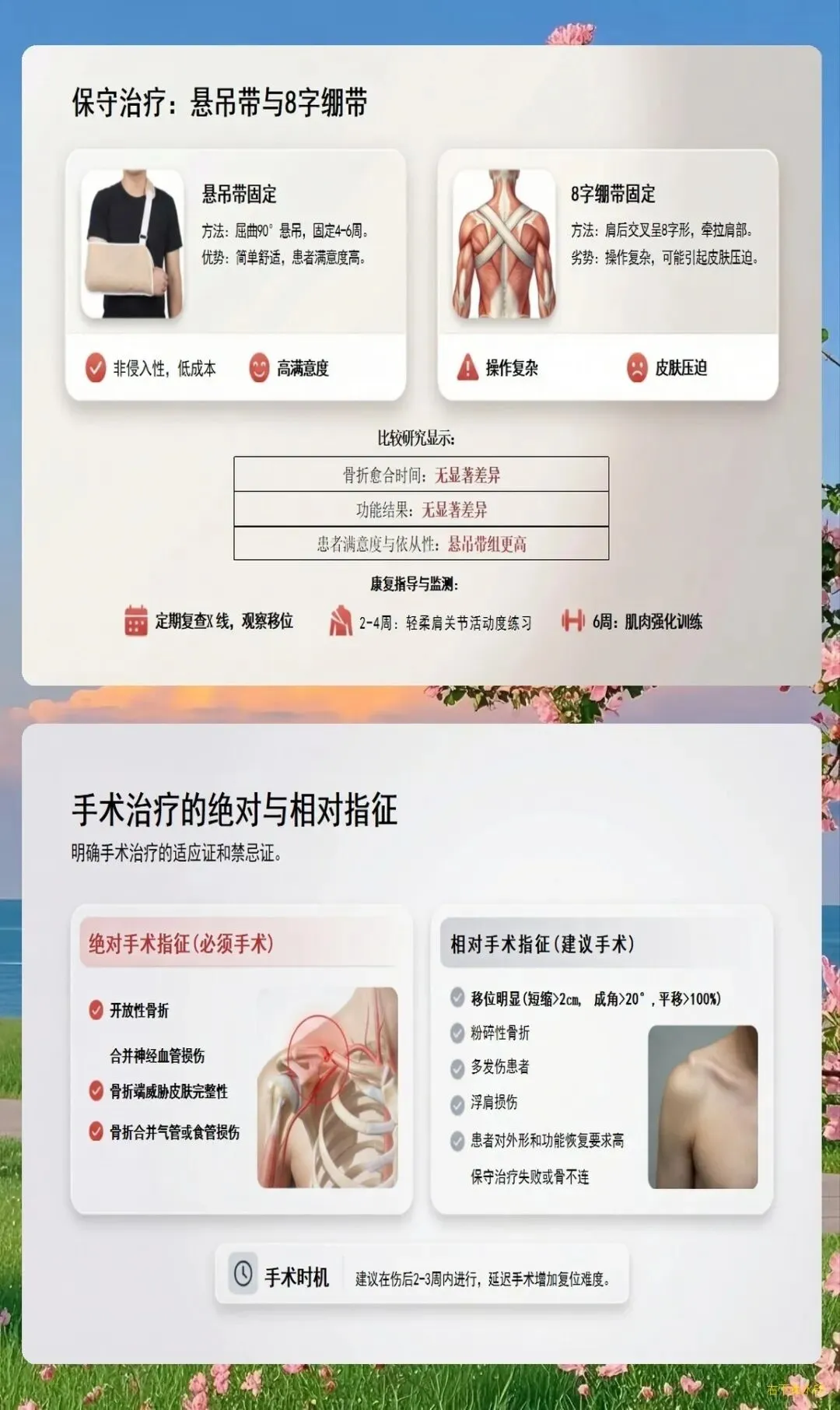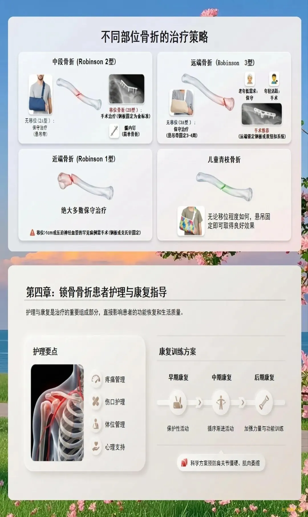 锁骨骨折非手术治疗的主要方法是使用"8"字绷带或三角巾悬吊固定。护理要点包括: