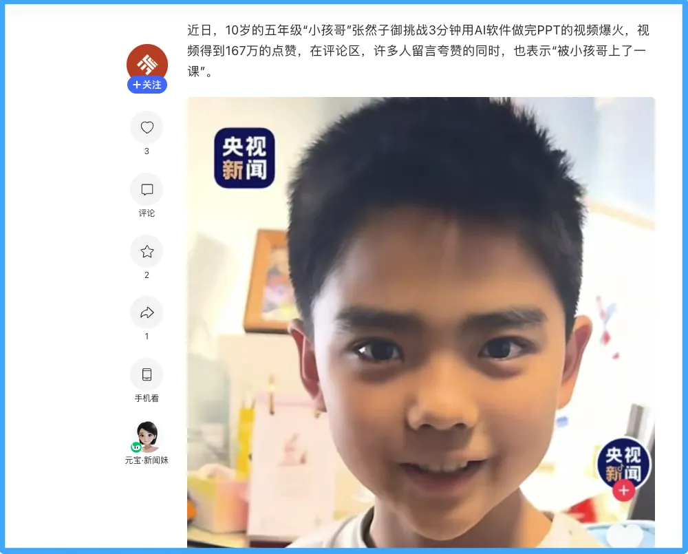 10岁小孩哥用AI 3分钟做完PPT,167万人点赞,但没人回答那个关键的问题