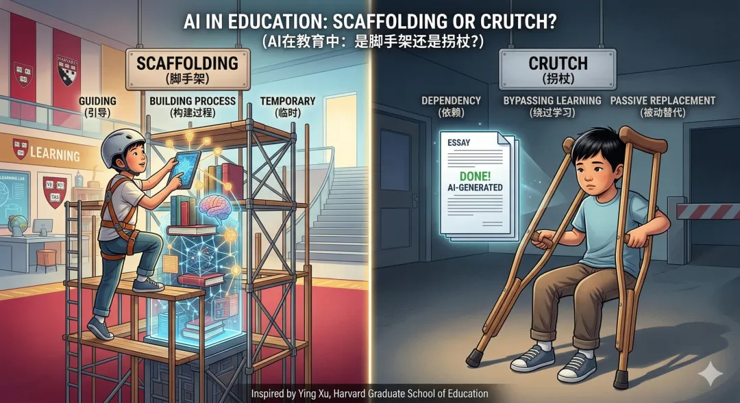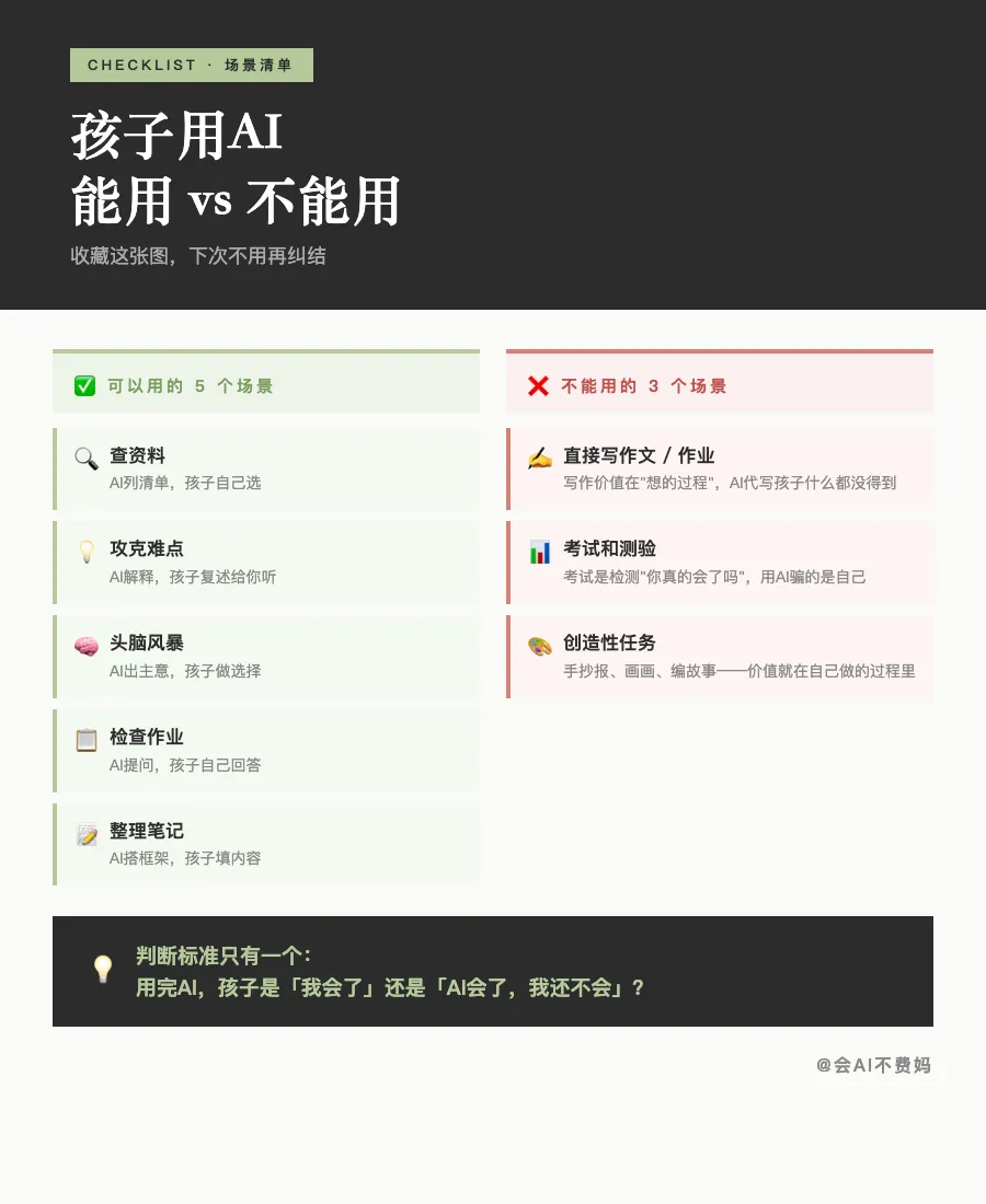前段时间,一个10岁的五年级男孩张然子御,用AI 3分钟做完了一个PPT。评论区里,有人说“被小孩哥上了一课”,有人说“这孩子以后了不得”,也有人开始担心:“这样下去,孩子还会自己思考吗?”吵了这么久,没有人回答那个更关键的问题:孩子到底能不能用AI?我查了中国、美国、欧盟的政策,发现一件有意思的事:中国直接明了。2025年5月教育部发布的指南,把规定写得很清楚:小学阶段,禁止独自使用AI内容生成功能;初中可以探索;高中才允许更多。还有"六不准"——不得直接复制、不得用AI考试……美国走的是另一条路。鼓励用,但强调「人在回路中(human in the loop)」。AI辅助,人类决策。白宫2025年4月的行政命令,把AI素养列为国家教育优先事项。美国一些学区甚至做了个“红绿灯”系统:绿灯可用、黄灯谨慎、红灯禁止。欧盟尤为谨慎。在《欧盟AI法案》里,教育领域的AI应用被列为「高风险」和医疗、执法一个级别。因为我自己也干过这事儿:孩子作业不会做,我第一反应就是「用AI查一下」。但现实是:我已经工作了一整天,脑子像一团浆糊,这时候还要跟孩子解释为什么这道题要这样想,真的很难。所以当孩子说“妈妈这道题我不会”,我掏出手机打开AI时,我只是在透支的状态下,做了一个省力的选择。要工作、要顾家、要陪伴、要教育……现在还要正确地使用AI。我们不需要每次都做对。只需要知道:什么时候我在「帮娃」,什么时候我在「替娃」。哈佛教育研究院的Ying Xu教授,研究AI对儿童发展的影响。她提出了一个关键问题:当孩子用ChatGPT写作业时,Ta是在参与学习过程,还是在绕过它?- 结构化使用(有指导、有反思):大幅提升学习表现你可能会问:孩子用AI找到答案,和自己想出来,结果不是一样吗?当孩子自己思考时,大脑会激活前额叶皮层,负责执行功能、工作记忆、自我调节的区域。这个区域就像大脑的"健身房",越用越强。当孩子直接看答案时,大脑激活的是视觉皮层和语言理解区,负责接收信息的区域。这就是为什么,同样的答案,自己想出来的和别人告诉你的,效果天差地别。脚手架:帮你够到本来够不到的地方,但你还是要自己往上爬。等你会了,脚手架可以拆掉。拐杖:你本来能走,但用了它,你就不用走了。用久了,腿会萎缩。让AI给孩子列出10本相关书单,或者10个学习资源。然后让孩子自己决定看哪个、为什么选它。引导语:“AI给你找了这些,你最想看哪个?为什么?”数学题不会,让AI用三种不同方式解释。然后关掉AI,让孩子用自己的话讲给你听。要写作文不知道写什么,让AI列出10个角度。然后孩子自己选,自己写。作业写完,让AI扮演「挑剔的老师」,提3个问题,让孩子自己回答。让AI帮孩子把笔记整理成框架。然后孩子自己检查有没有遗漏,补充自己的理解。引导语:“AI帮你整理好了,你觉得有没有漏掉什么重要的?”写作的价值不在写出来,在思考的过程。AI代写,孩子跳过了最重要的部分。怎么做:先自己写草稿,哪怕写得很烂。再用AI帮忙改。怎么做:考前用AI找薄弱点,考后用AI分析错在哪里。但考试本身,必须自己来。手抄报、画画、编故事。这些任务的价值,就在自己动手做的过程里。AI直接生成,孩子什么都没得到。怎么做:用AI看优秀作品,分析好在哪里,但自己动手做。如果你不确定某个场景能不能用AI,问自己三个问题:更简单的判断:用完AI之后,孩子是「我会了」,还是「我还不会,但AI会了」?我是想说:我们教孩子「怎么用AI」的同时,更要教他们「什么时候不用AI」。那些必须自己思考、自己犯错、自己挣扎的时刻……那才是大脑真正在生长的时刻。下次孩子问你“能不能用AI帮我……”,先别急着说能或不能。