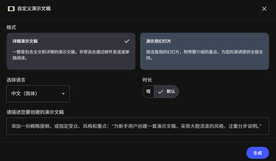 生成时可以选格式、语言、长短,也可以补充提示词,限定受众、重点和表达方式。生成后支持导出PDF 或 PowerPoint。