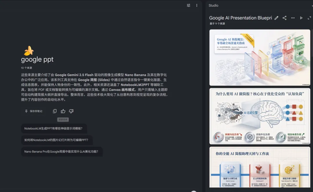 Gemini Canvas 可以直接根据提示词生成 slide presentation,也可以先上传文件(新版本支持导入notebookllm笔记本),再把现有文档转成 slideshow。