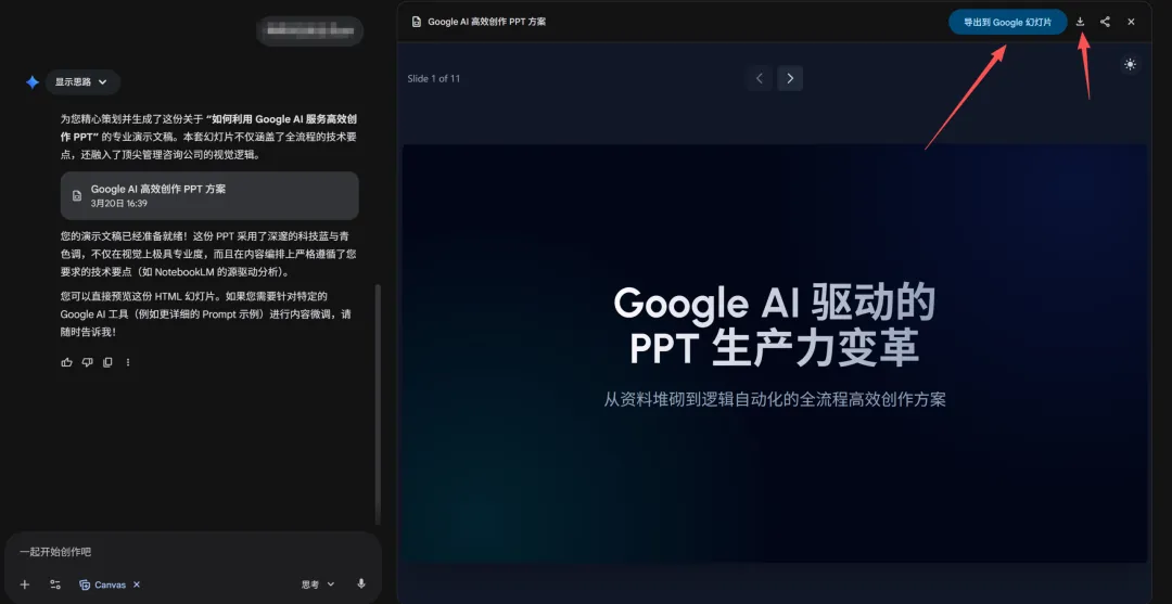 注意请一定要打开选择canvas画板功能,以及打思考模式,不然现在gemini的算力吃紧,很容易不出ppt,只给你文字回复(3.0版本的时候其实不会这样)