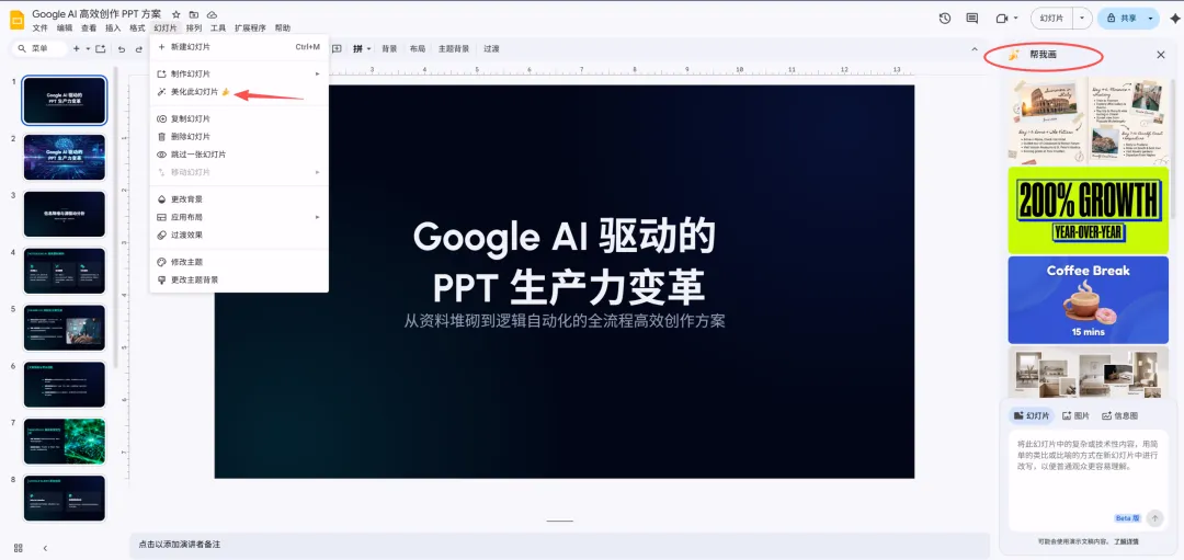 Google Slides 里的 Gemini,不是单纯聊天,而是直接嵌在编辑环境里。支持可以生成图片、生成新 slide、总结整份演示稿、重写文字,还可以调用 Drive 文件来补 slide 内容。对于 Workspace Experiments,还支持参考或套用当前演示文稿的风格。