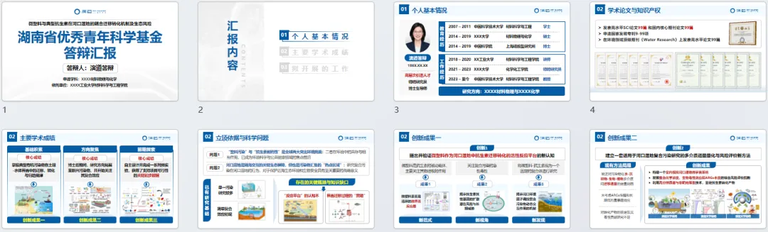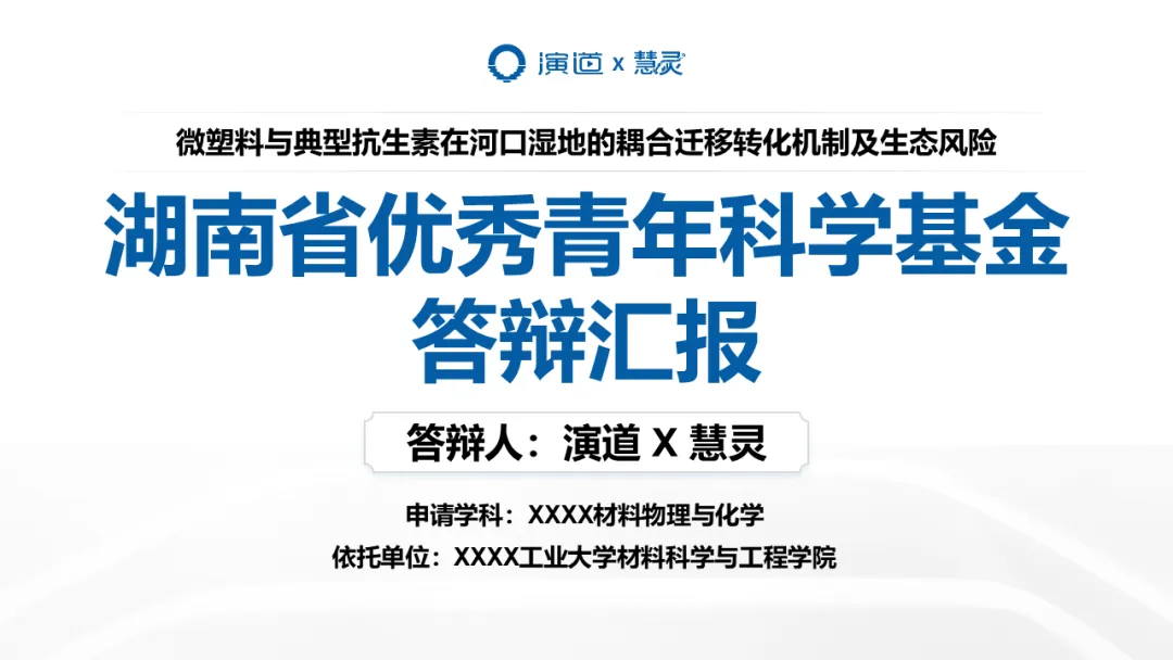 这份PPT是湖南省优秀青年科学基金(B类) 申请答辩汇报,主题为微塑料与典型抗生素在河口湿地的耦合迁移转化机制及生态风险,答辩人依托某工业大学材料科学与工程学院,申请学科为材料物理与化学,核心围绕该研究方向的个人基础、学术成果、研究痛点及拟开展工作展开全面阐述,以下是核心总结:- 教育与工作背景:本科毕业于中国科学技术大学材料科学与工程专业,博士就读于XXX大学材料物理与化学专业、中国科学院上海硅酸盐研究所,拥有讲师、特聘研究员、教授等多阶段任职经历,现为高层次引进人才、特聘研究员、博士生导师。