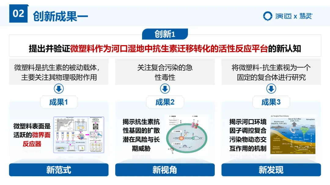 - 创新1:提出并验证微塑料作为河口湿地中抗生素迁移转化的活性反应平台的新认知,突破传统将微塑料视为抗生素被动载体的认知,从动态交互、长期风险、微界面反应等新视角开展研究。