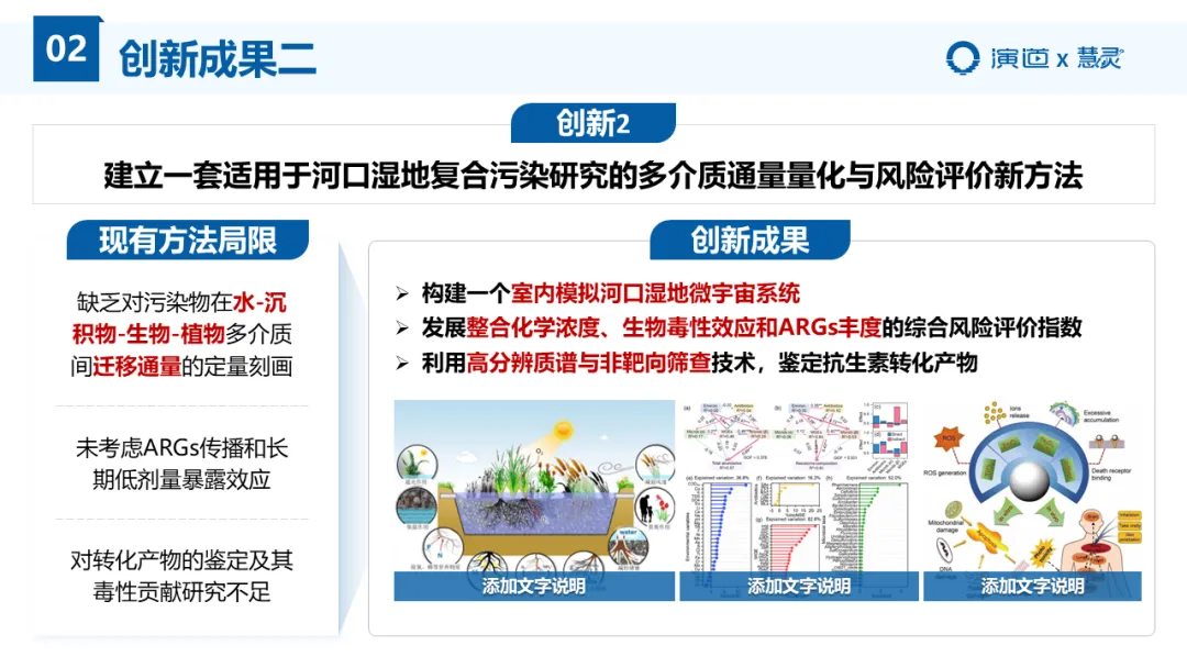 - 创新2:建立适用于河口湿地复合污染研究的多介质通量量化与风险评价新方法,针对现有方法的量化、风险考量、产物研究不足等问题,构建室内模拟微宇宙系统、发展综合风险评价指数、利用先进技术鉴定抗生素转化产物。
