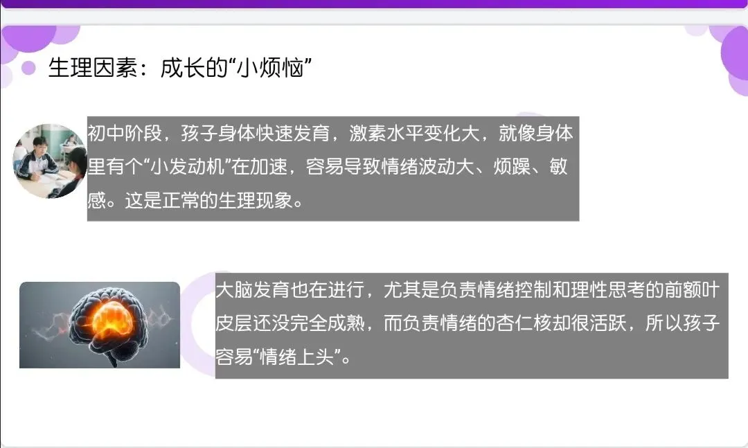 今天这堂课,就是想帮大家拨开成长的迷雾,从科学认知、成因分析、情绪管理三个维度,解锁和初中生沟通的密码。接下来,就让我们一起走进今天的分享,一起学习如何成为孩子心理成长路上的“护航者”。