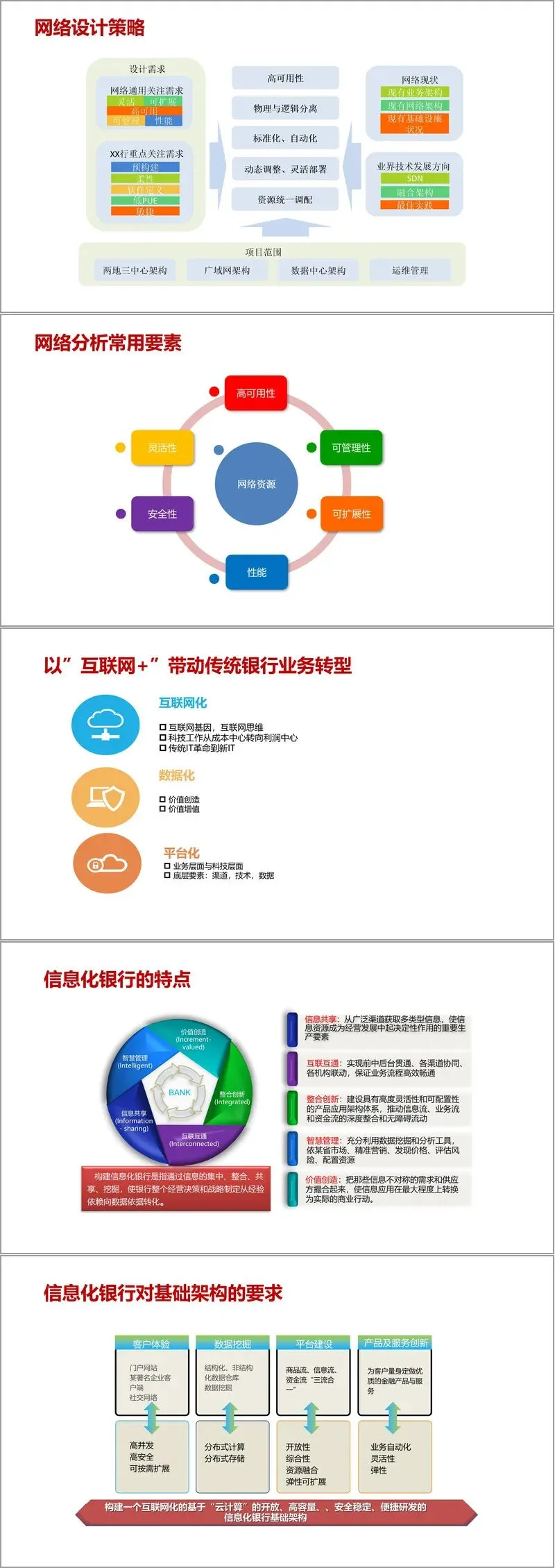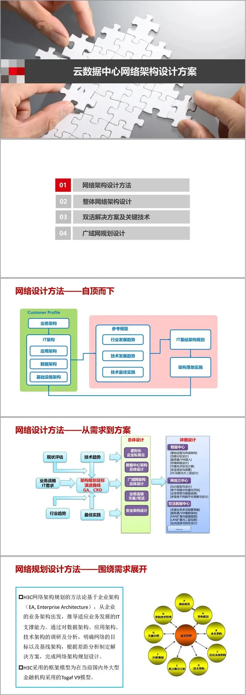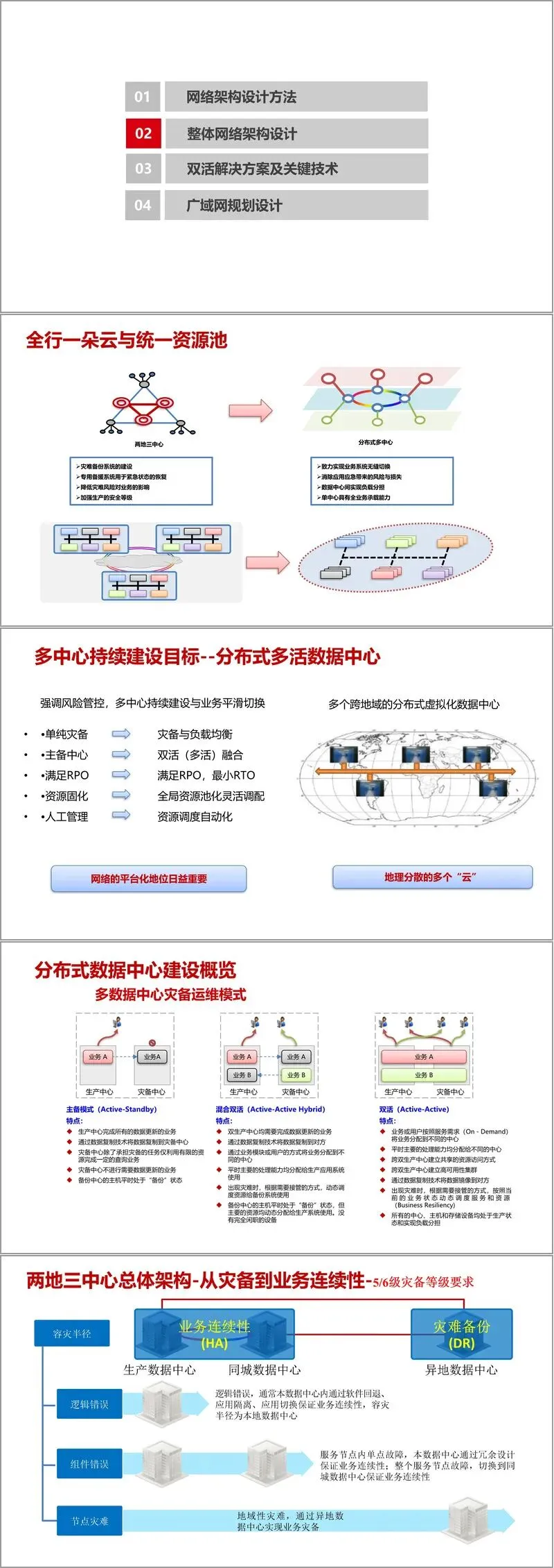 本文件是 H3C 推出的云数据中心网络架构设计方案,围绕 “开放、高容量、安全稳定、便捷研发” 的核心需求,构建了覆盖网络架构设计方法、整体架构、双活解决方案及广域网规划的全维度体系,为信息化银行等场景提供了可落地的技术蓝图。