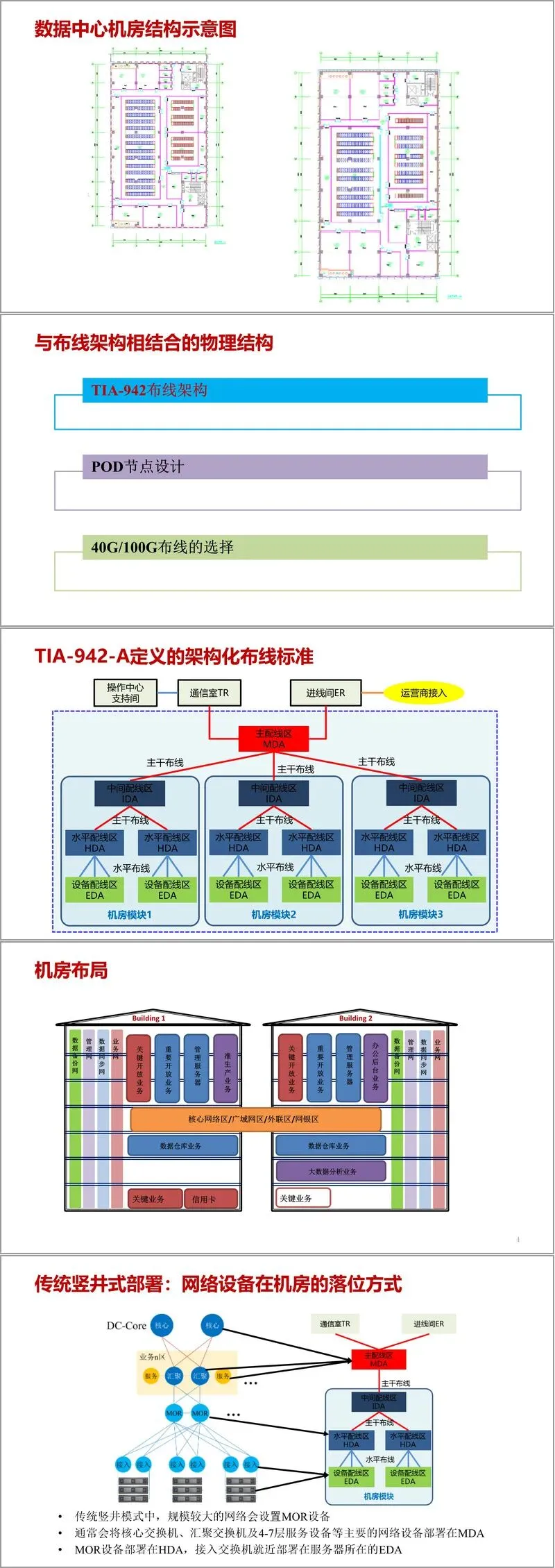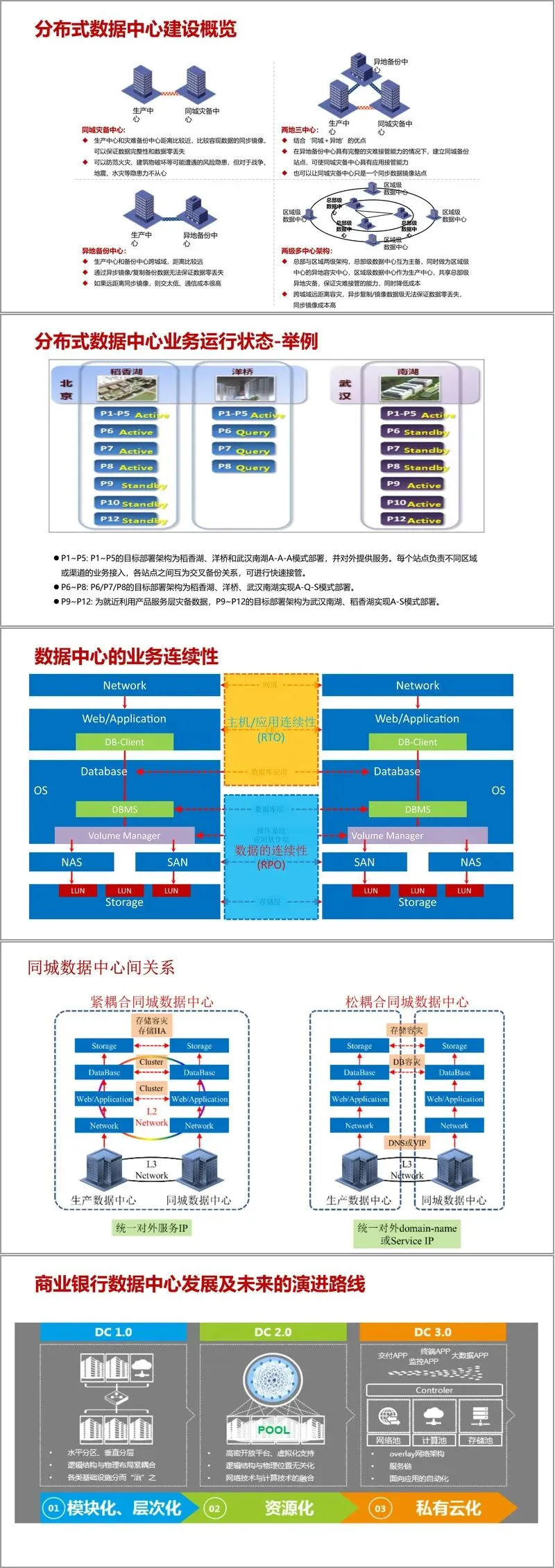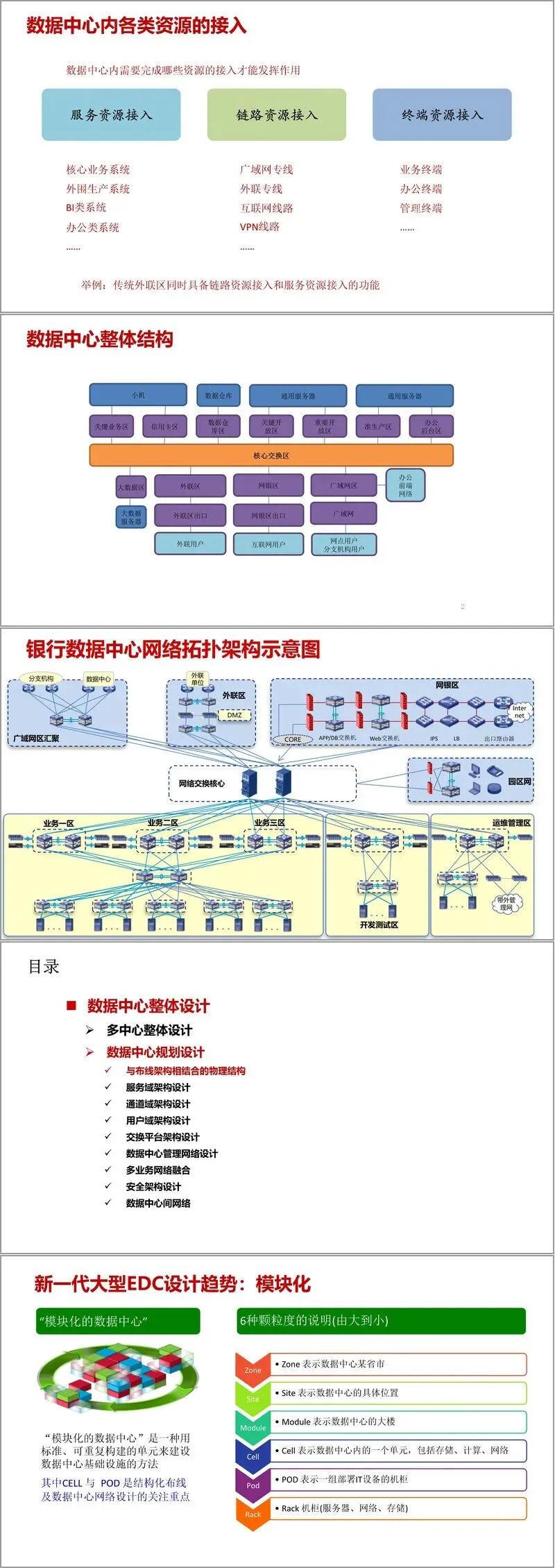 整体网络架构以 “全行一朵云与统一资源池” 为核心,构建了从两地三中心到分布式多活数据中心的演进路径。两地三中心架构整合同城灾备与异地备份优势,可抵御逻辑错误、节点灾难及地域性灾难,满足 5-6 级灾备等级要求;分布式多活数据中心则实现从单纯灾备到负载均衡的转型,通过全局资源池化、自动化调度,达成 “任意服务器部署于任意机架,为任意业务提供服务” 的目标。数据中心内部采用模块化设计,按 Zone、Site、Module、Cell、Pod、Rack 六级颗粒度划分物理结构,结合 TIA-942 布线标准,实现基础设施的标准化与可扩展。