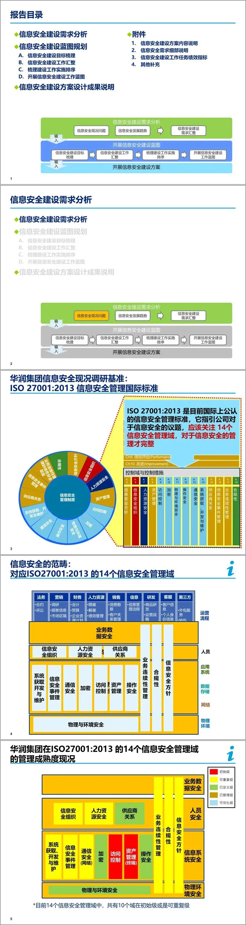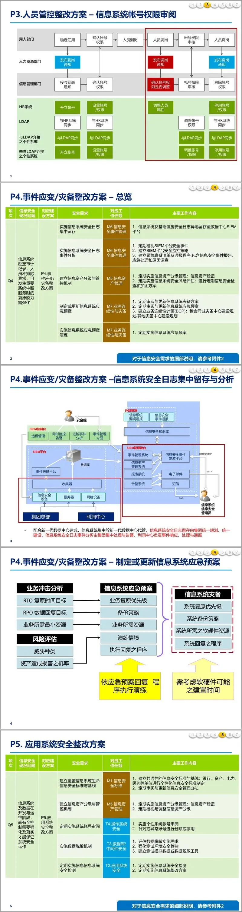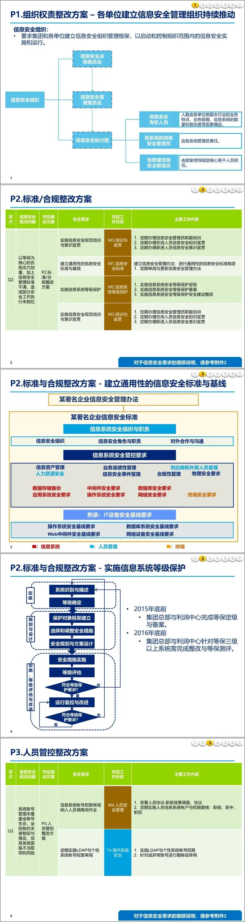 在实施规划上,方案遵循“低投入优先、紧迫问题优先” 原则,确定七大方案的优先序为组织权责、标准 / 合规、终端管控、事件应变 / 灾备、人员管控、网络管控、应用系统安全。演进路线分为建设规划、体系试点、体系推广三个阶段,明确 2014 年底前完成管理边界界定、标准设计等基础工作,2015-2016 年开展试点落实,2017-2020 年全面推广,目标是 2016 年底集团、2020 年底利润中心的 14 个信息安全管理域均达到已定义级以上。