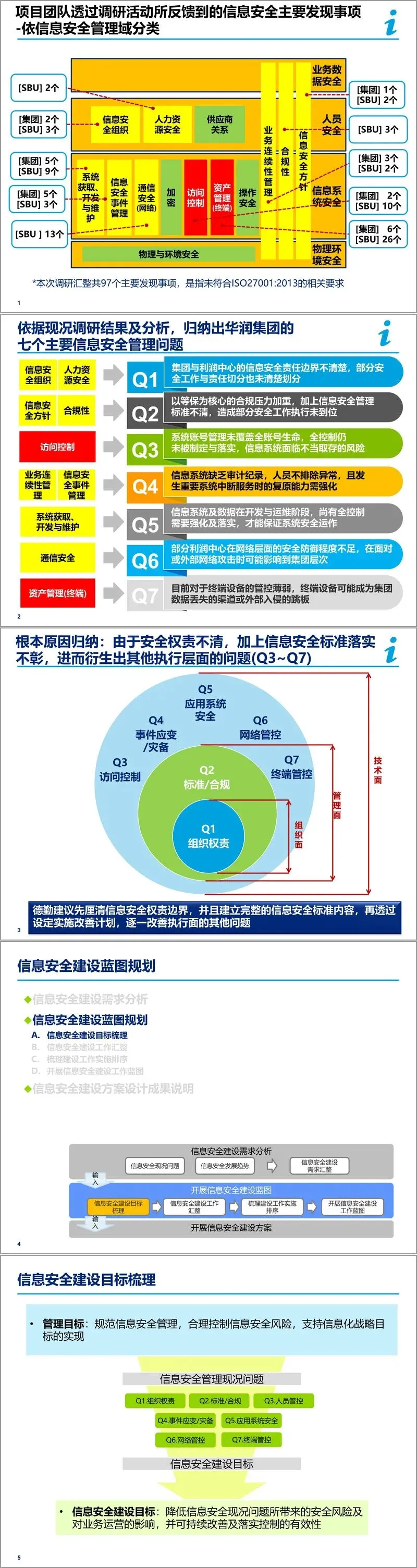 方案以 ISO27001:2013 信息安全管理国际标准为调研基准,明确信息安全需关注 14 个管理域,涵盖信息安全方针、组织、人力资源安全等多个维度,且需覆盖企业人员、信息、应用系统、数据存储、网络基础架构及物理环境等各个层面。通过调研发现,该企业 14 个信息安全管理域中,10 个处于初始级或可重复级,共梳理出 97 个未符合标准的主要发现事项,归纳为七大核心问题:集团与利润中心安全责任边界不清、合规压力下安全管理标准不明、系统账号全生命周期管控缺失、信息系统审计与灾备能力不足、应用系统开发运维安全控制薄弱、部分利润中心网络安全防御不足、终端设备管控薄弱。