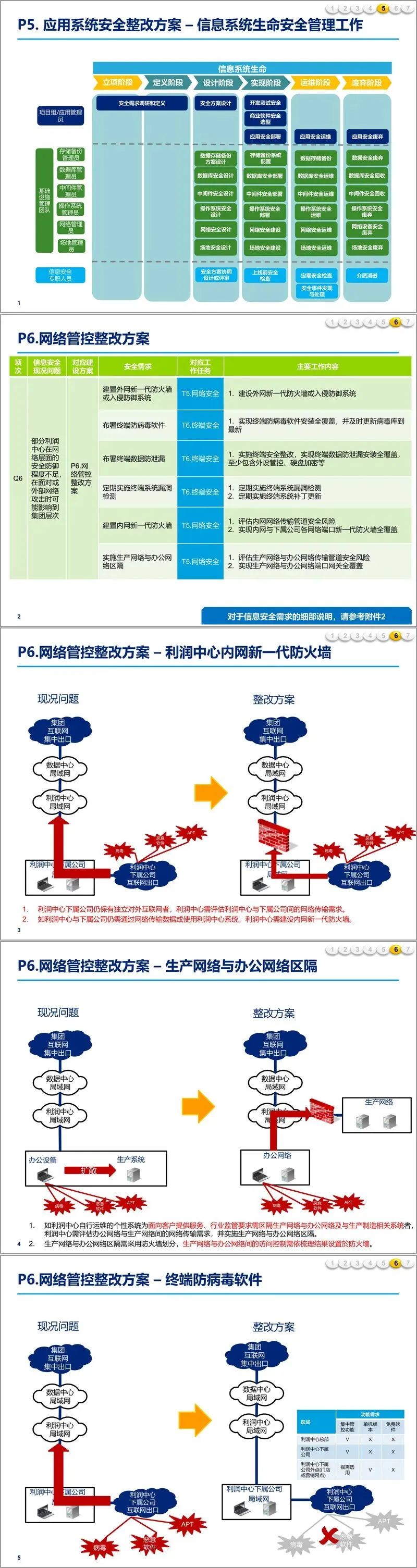 针对这些问题,方案确立了规范管理、控制风险、支持信息化战略目标实现的核心目标,提出七大整改方案。组织权责整改方案明确集团与利润中心管理层及执行层的安全责任边界,建立信息安全管理组织并配备专职人员;标准 / 合规整改方案通过建立通用安全标准与基线、实施等级保护、开展培训宣贯,应对合规压力;人员管控整改方案将账号权限审阅纳入人员调离岗流程,定期开展账号权限审计;事件应变 / 灾备整改方案实现安全日志集中留存与分析,建立资产分级管控机制及应急预案并定期演练;应用系统安全整改方案覆盖系统全生命周期,实施数据脱敏与安全检测;网络管控整改方案通过部署防火墙、防病毒软件、数据防泄漏工具等强化网络防御;终端管控整改方案收回用户本地最高权限,强制智能终端安全配置,建立终端安全基线与网络准入机制。