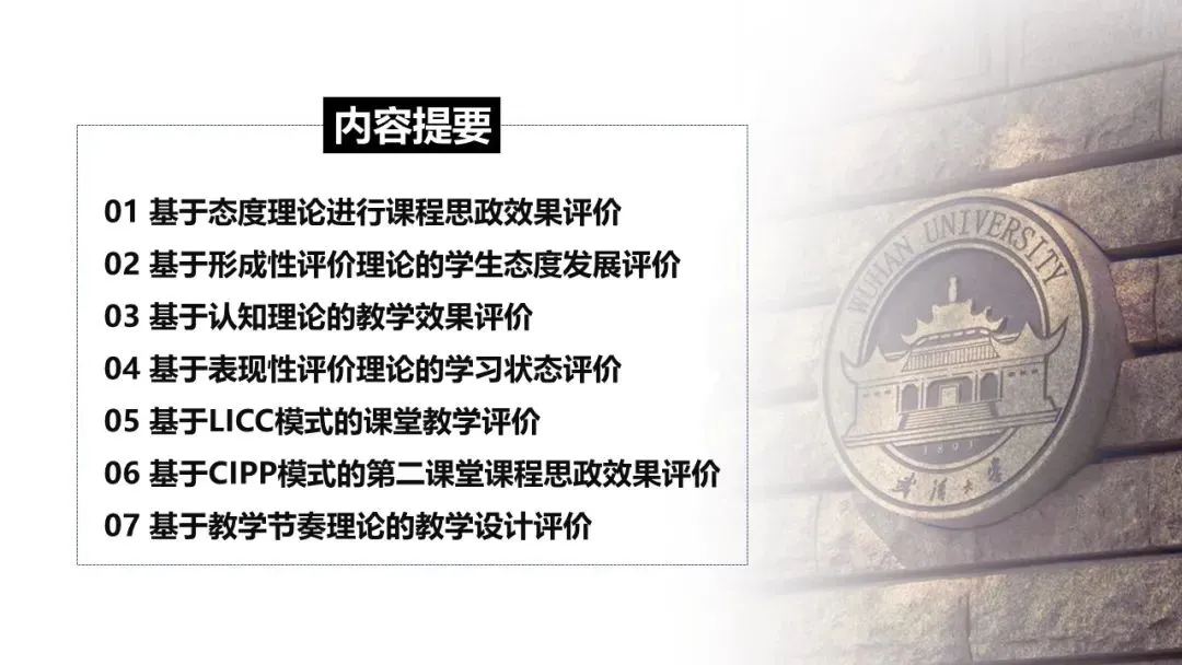接下来,王郢围绕基于态度理论进行课程思政效果评价、基于形成性评价理论的学生态度发展评价、基于认知理论的教学效果评价、基于表现性评价的学习状态评价、基于LICC模式的课堂教学评价和基于CIPP模式的第二课堂课程思政效果评价、基于教学节奏理论的教学设计评价等领域,系统介绍了中心有关课程思政效果评价的理论研究和具体实践。