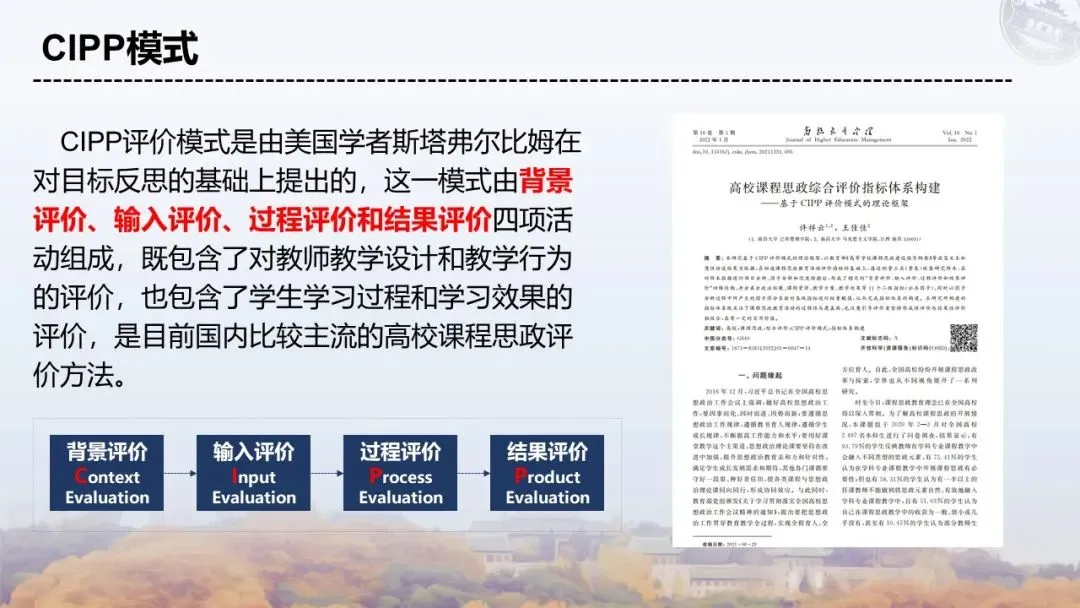 王郢以《国际经济学》为例引入CIPP评价模式。这一模式由美国学者斯塔弗尔比姆在对目标反思的基础上提出的,由背景评价、输入评价、过程评价和结果评价四项活动组成,既包含了对教师教学设计和教学行为的评价,也包含了学生学习过程和学习效果的评价,是目前国内比较主流的高校课程思政评价方法。她介绍了学生参观江汉关博物馆评价方案的具体设计,该评价方案以问卷形式,从课前调研问卷、课程开启到课后感言,在“历史”这一主线之下观察分析学生的情感体验和观点的明显变化。