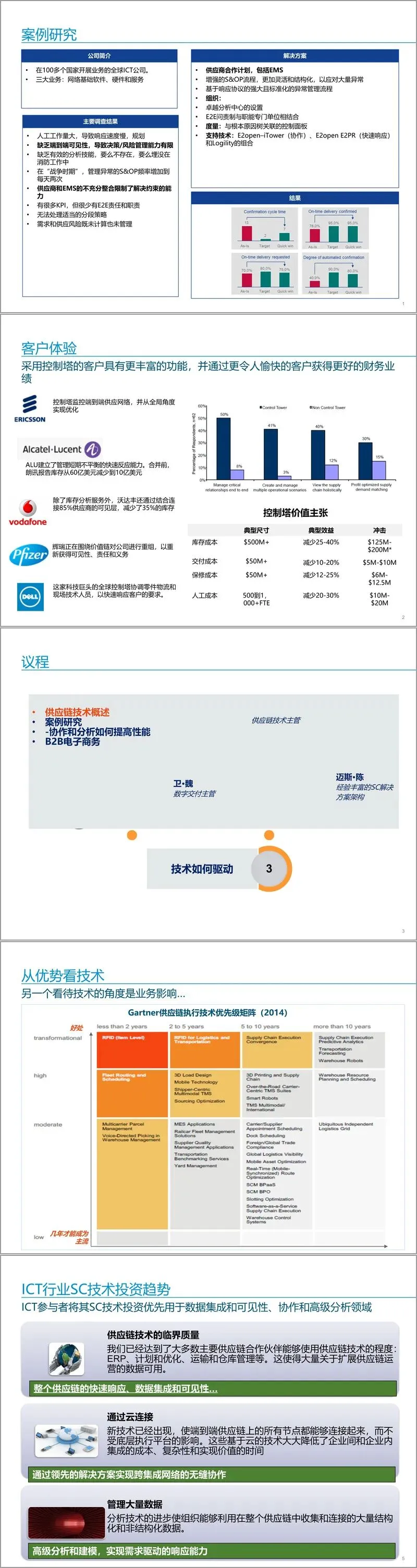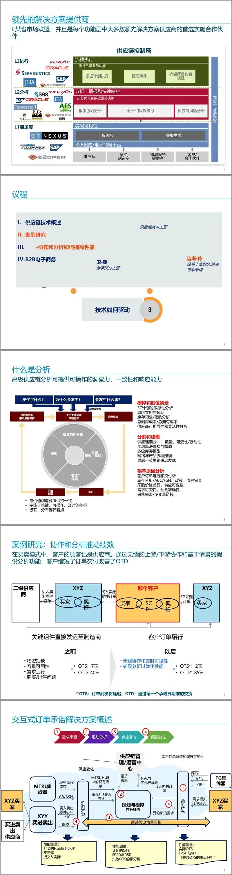 技术是驱动ISC+转型的关键力量。方案分析了供应链技术发展趋势,指出ICT企业应优先投资于数据集成与可见性、协作平台及高级分析等领域。通过B2B电子商务平台、全渠道架构、云服务及大数据分析,企业能够实现供应链的实时协同与智能优化。文中还详细阐述了基于Hybris等平台的全渠道商务解决方案架构,突出了前后端集成、多渠道融合的技术路径。