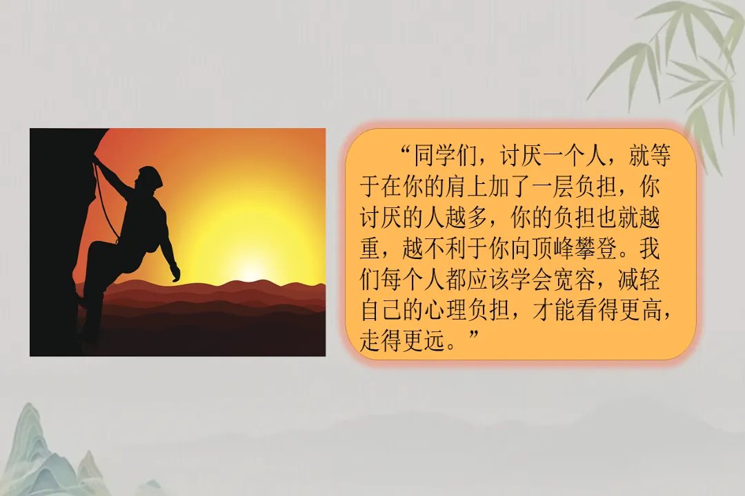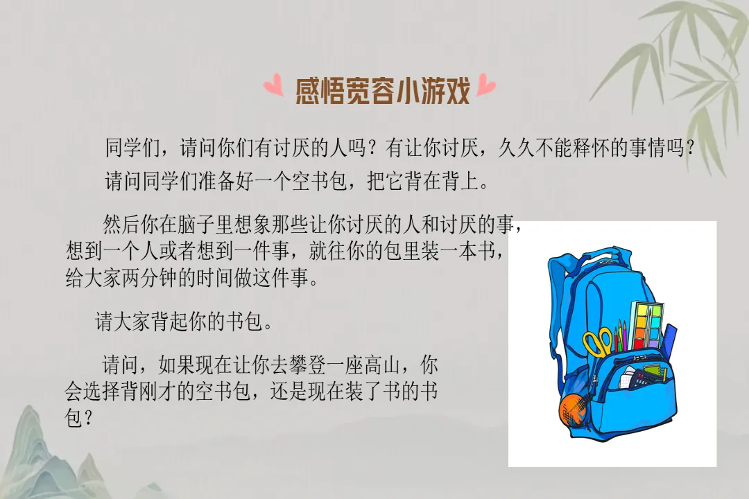 先跟大家做个小游戏,大家想想有没有讨厌的人、放不下的事,把这些都想象成书装进空书包里,再背起书包。大家肯定都愿意背空书包爬山,讨厌的人和事就是肩上的负担,装得越多,走得越累,学会宽容,才能卸下负担,走得更远。