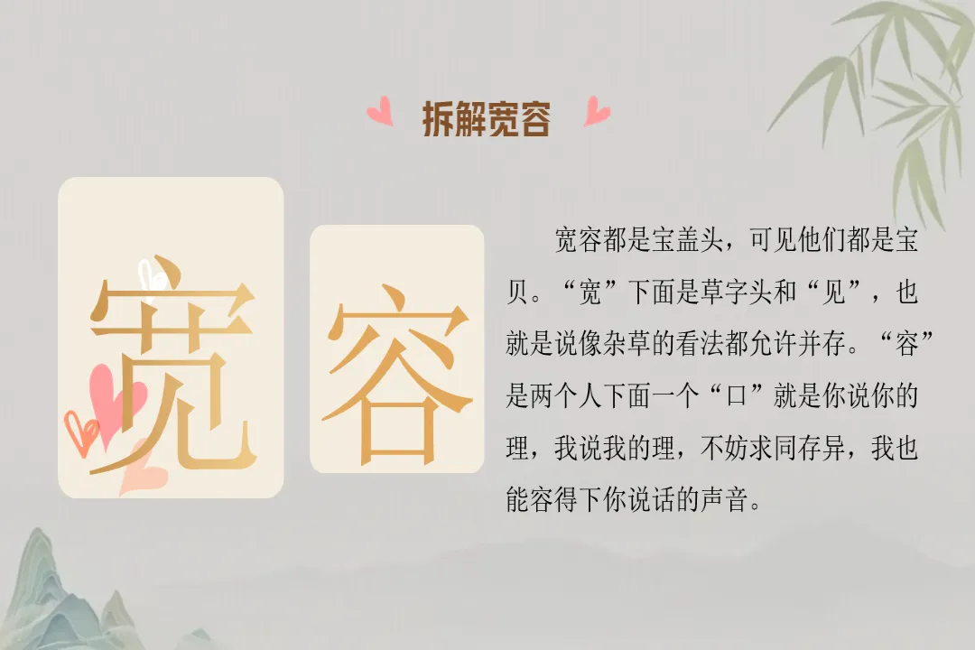我们来看看 “宽容” 两个字,都是宝盖头,说明这是很珍贵的东西。“宽” 字下面是草字头和见,就是说不管什么看法,都能允许存在;“容” 是两个人一个口,就是你有你的理,我有我的理,能听进去别人说话,求同存异。
