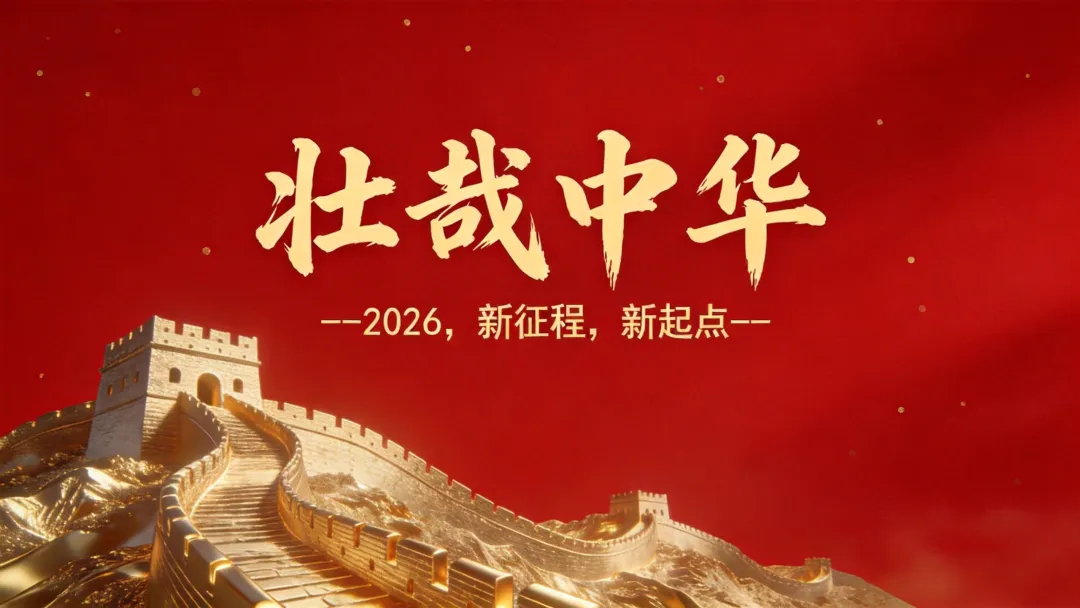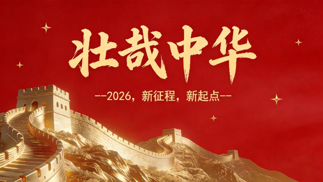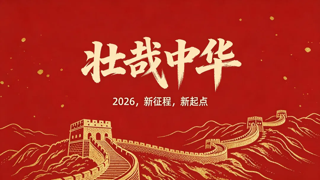 以朱砂红为主色调,少量金色星星点缀,无太多元素,简约,底部由左下方往斜上方是鎏金色立体感高仿实景万里长城,营造出富有动感与壮观视觉效果,冲击感强。主题文案浅金色草书字体:“壮哉中华”,辅助文字:--2026,新征程,新起点--,极简设计。