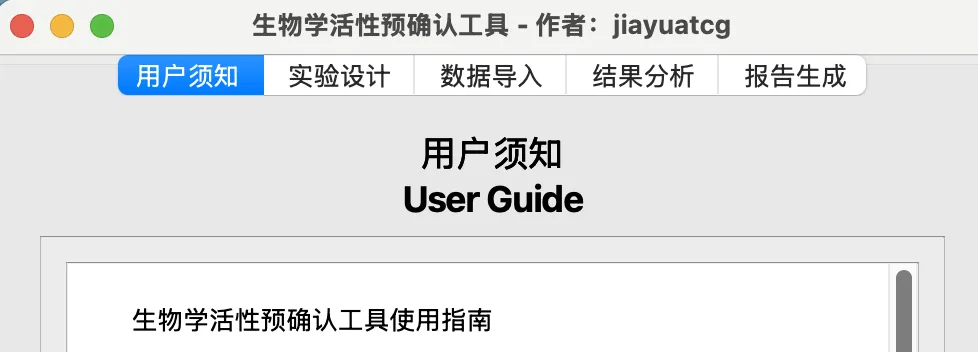 双击打开后,界面包括“用户须知”,“实验设计”,“数据导入”,“结果分析”和“报告生成”五部分。