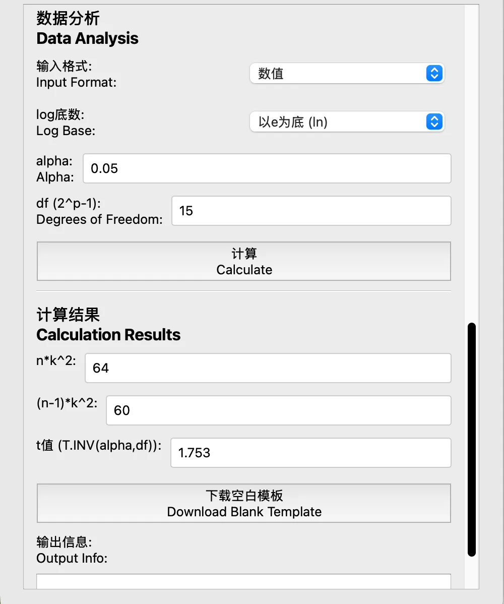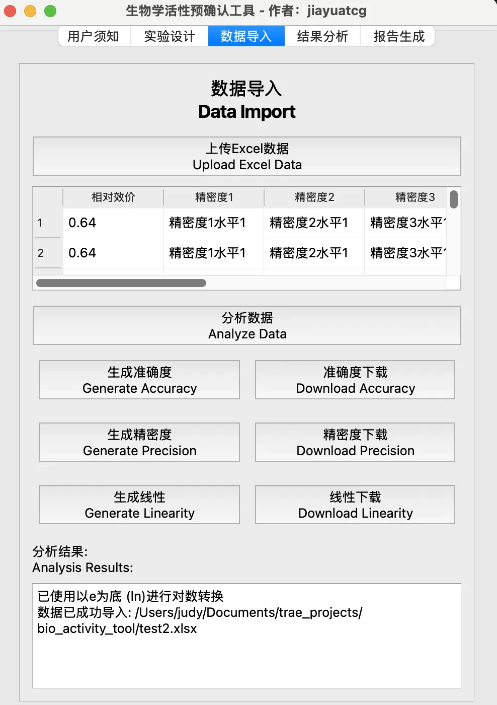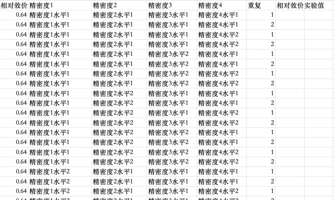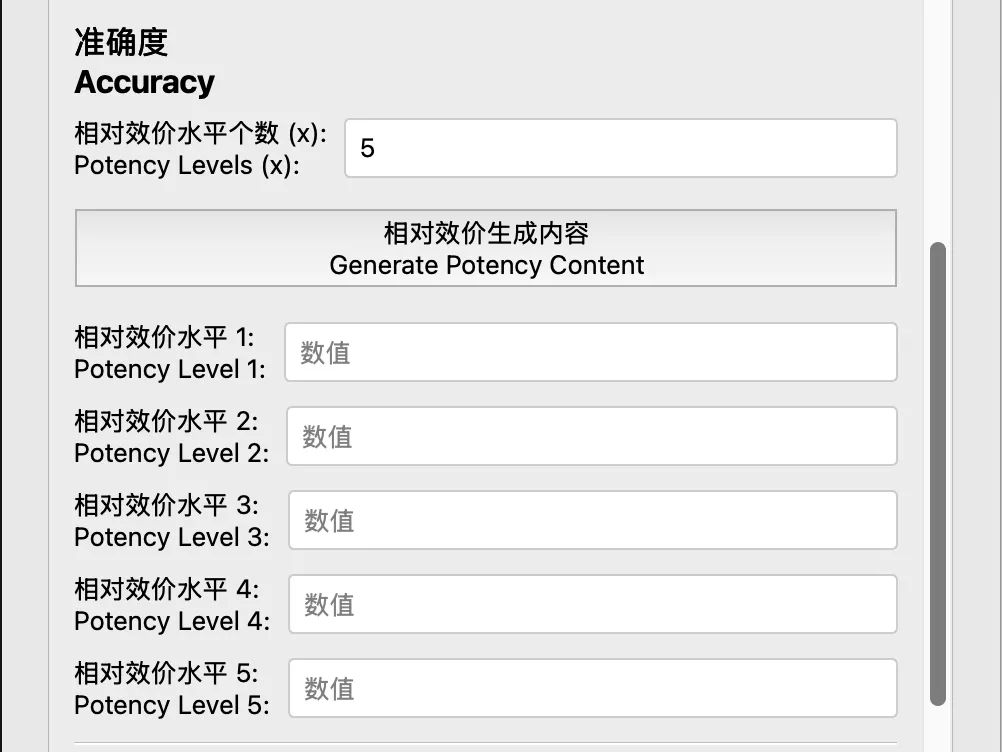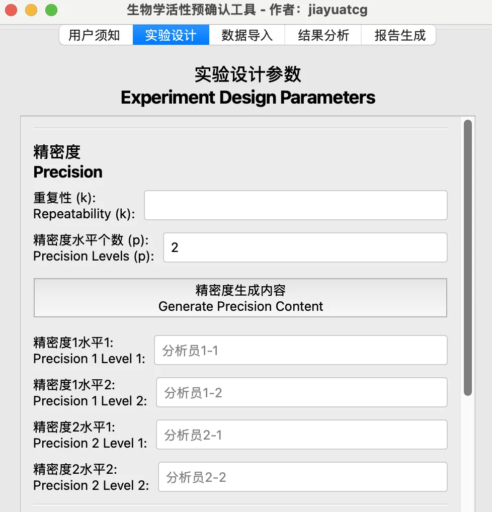 输入精密度的个数和重复次数,输入准确度的相对效价水平,输出相应的空白数据模板。