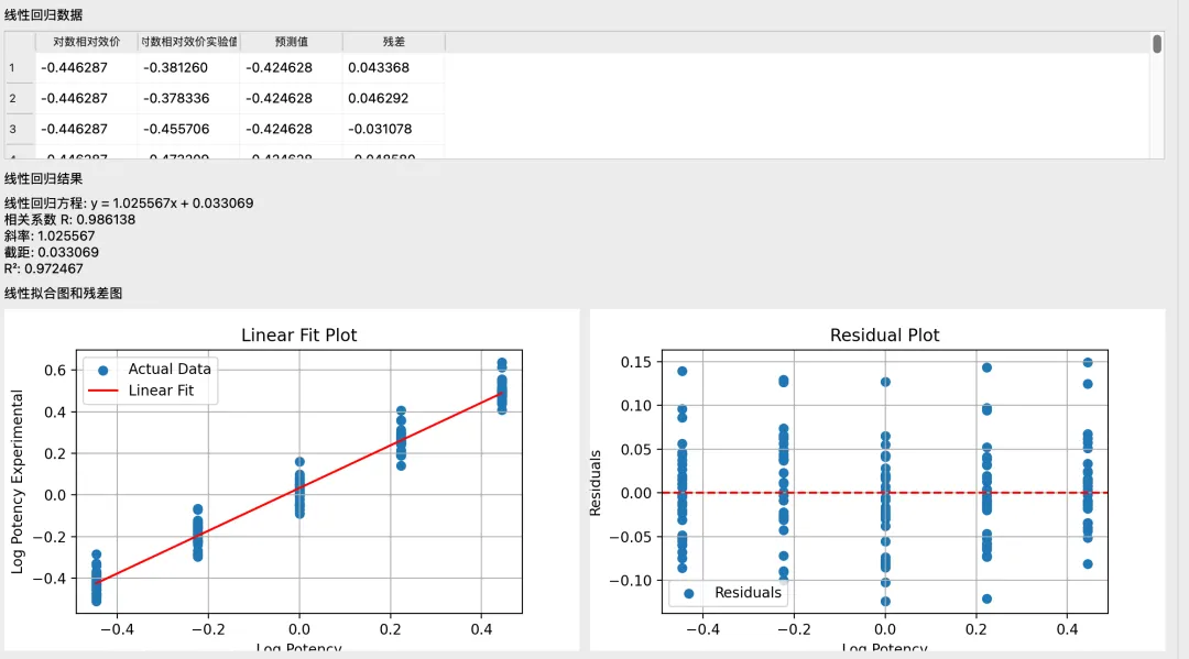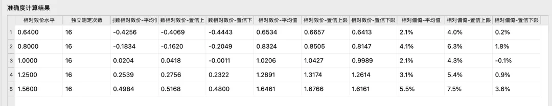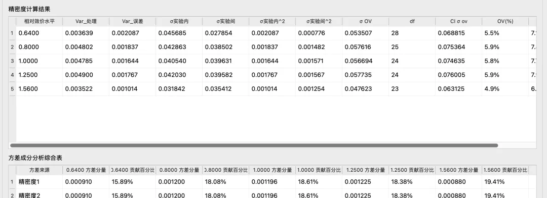 获取准确度,精密度,线性的数据和图表。其中,精密度增加了“方差成分分析”,让bioassayer们对贡献方差最大的精密度因素多多留意(注:数据以9401的验证示例为准)。