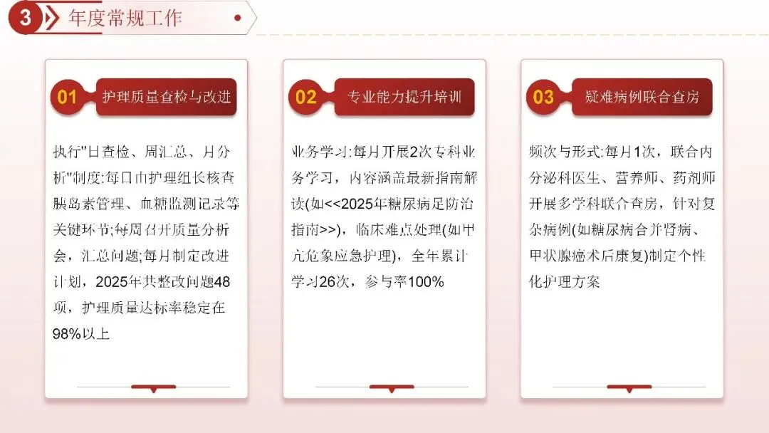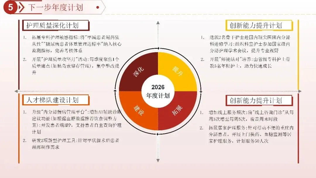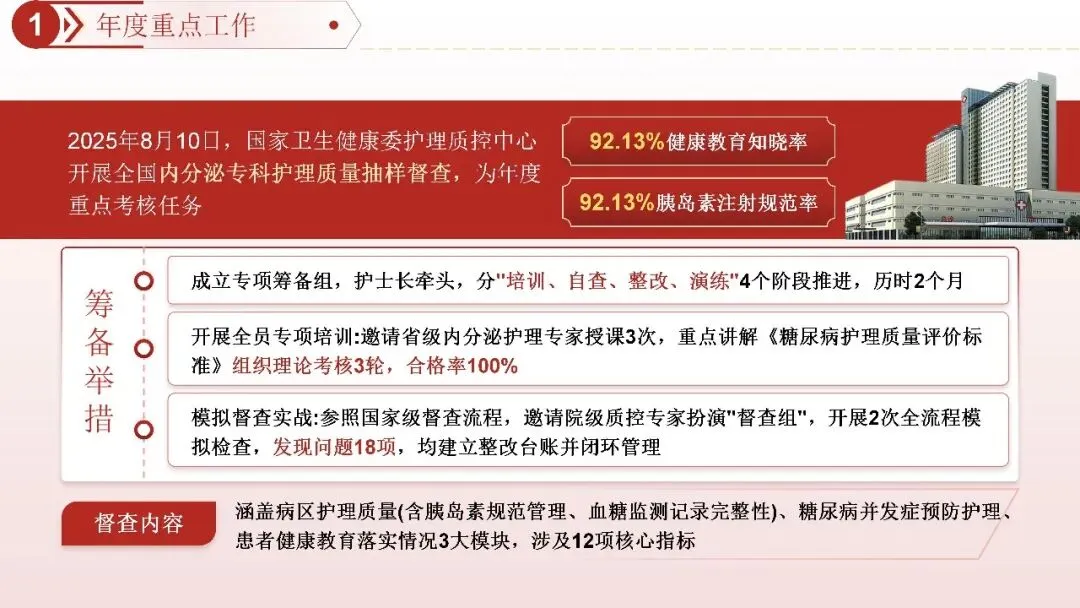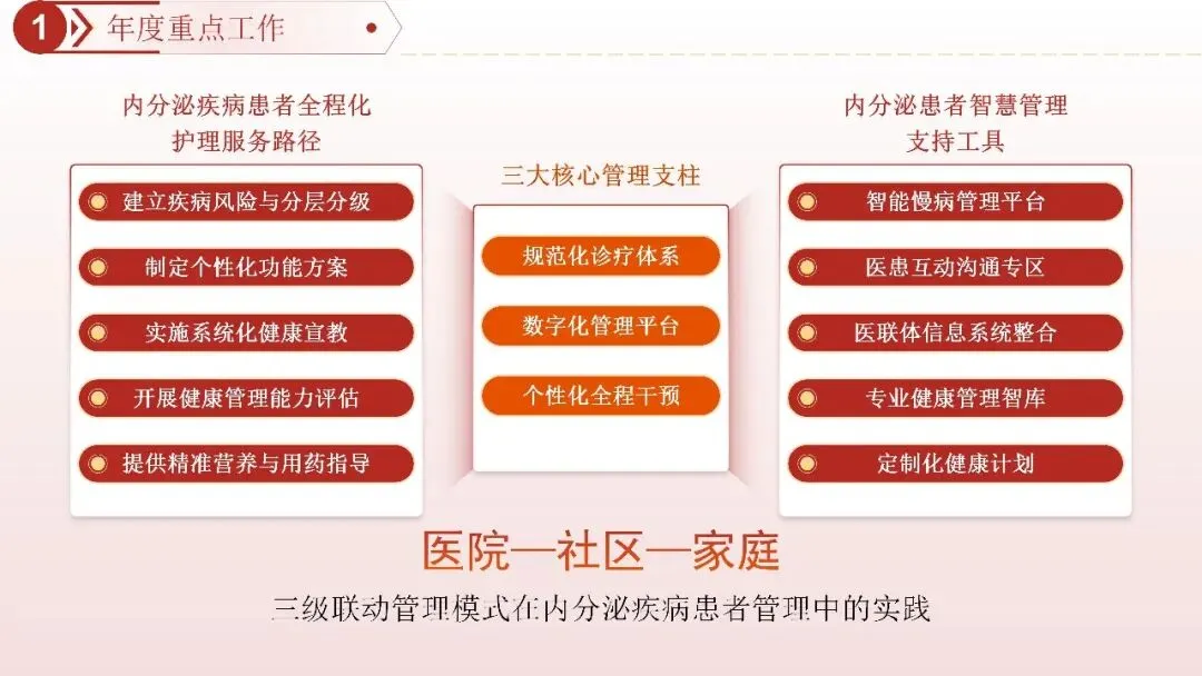 - 年度重点工作高标准完成国家级内分泌专科护理督查迎检,搭建 “互联网 + 内分泌” 智慧护理体系,构建内分泌患者全程化护理与医院 - 社区 - 家庭三级联动管理模式。