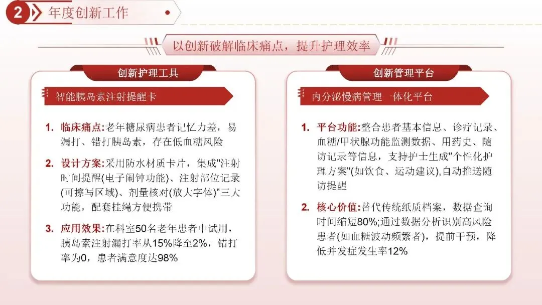 - 年度创新工作研发智能胰岛素注射提醒卡,搭建内分泌慢病管理一体化平台,破解临床痛点,提升护理安全与管理效率。