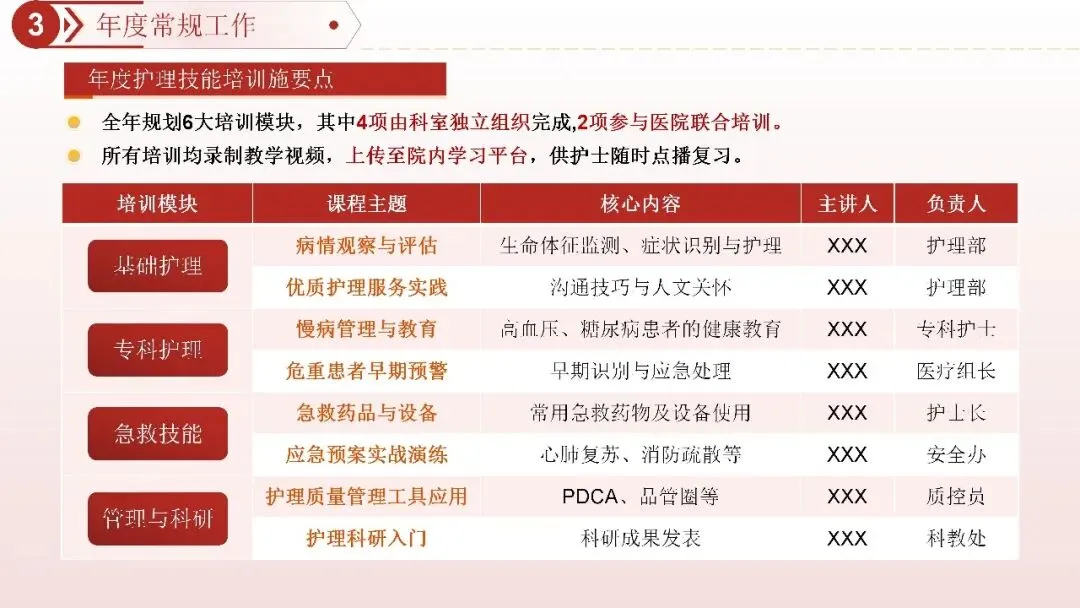 - 下一步年度计划围绕护理质量深化、智慧护理升级、人才梯队建设、服务边界拓展四大维度,明确下一阶段发展目标与实施路径。