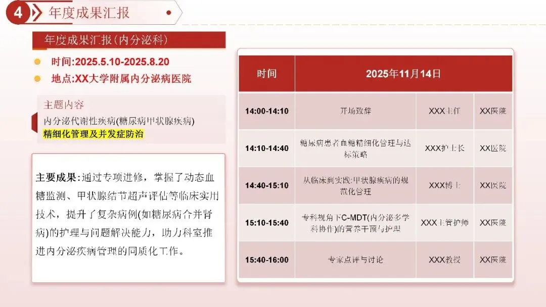 - 年度成果汇报完成专科进修深造,牵头举办专科护理学术会议,推动科室内分泌专科护理水平与同质化管理能力全面提升。