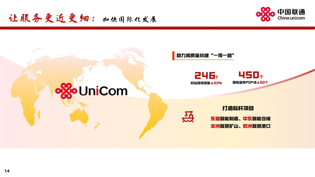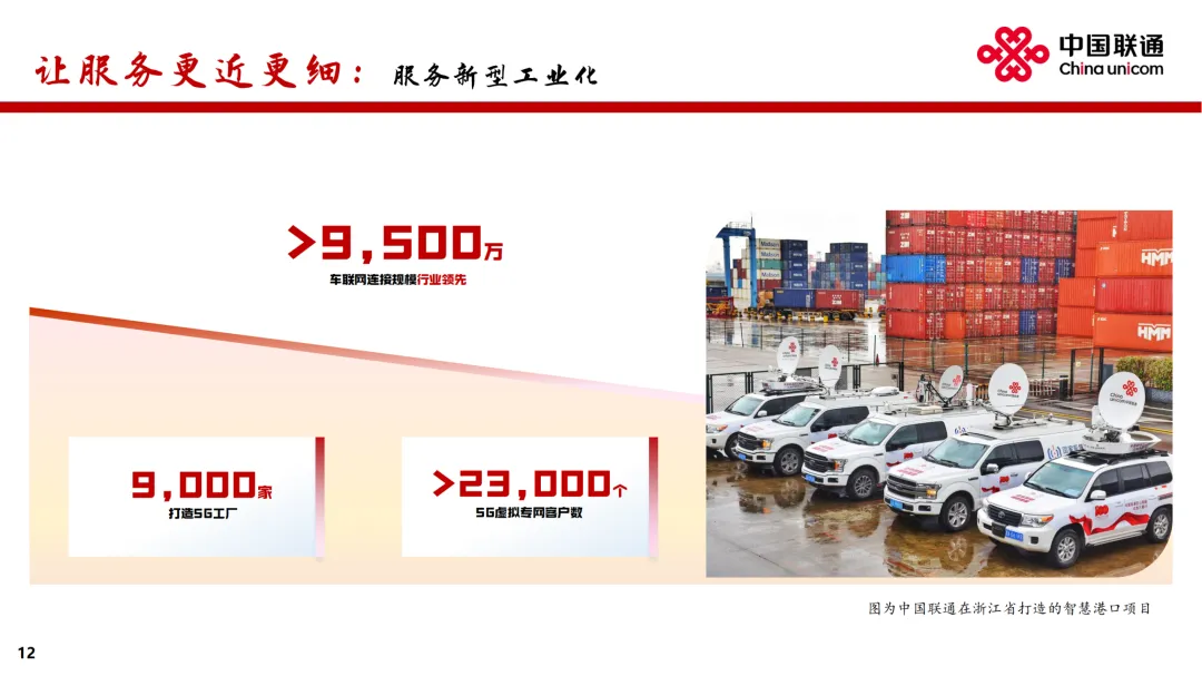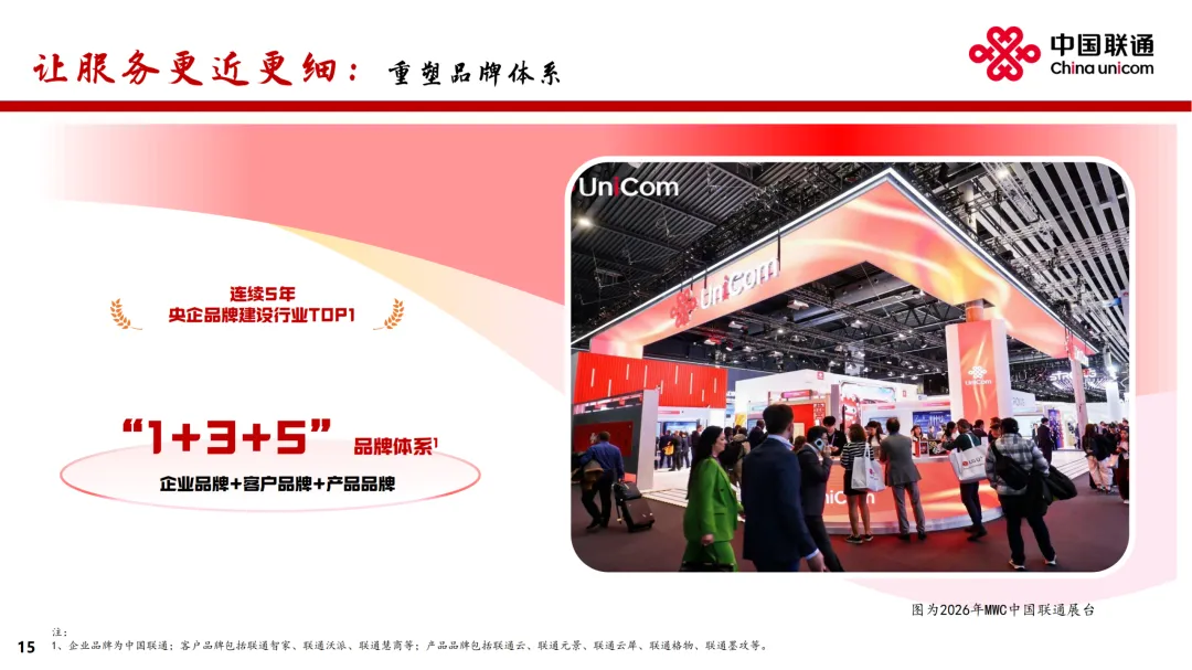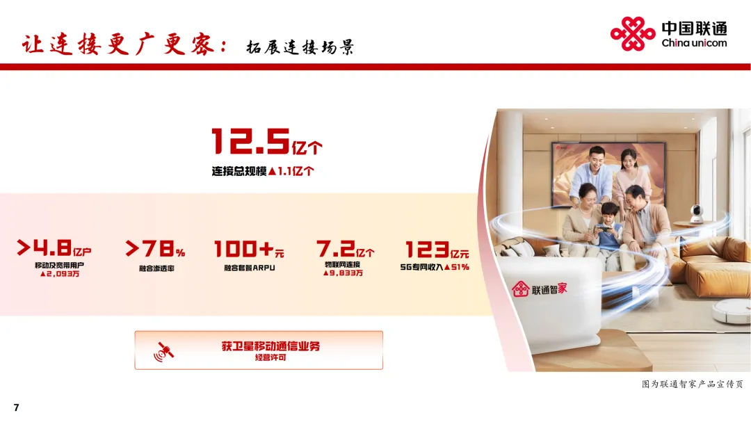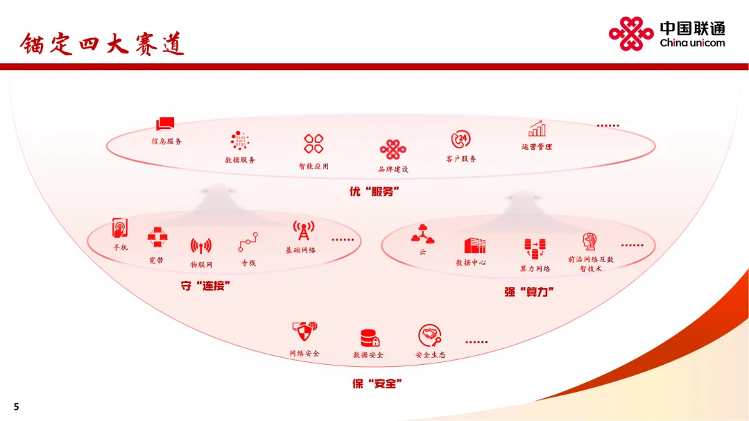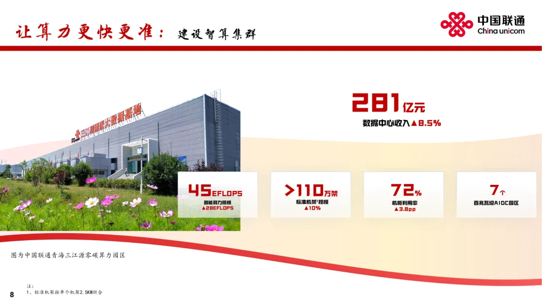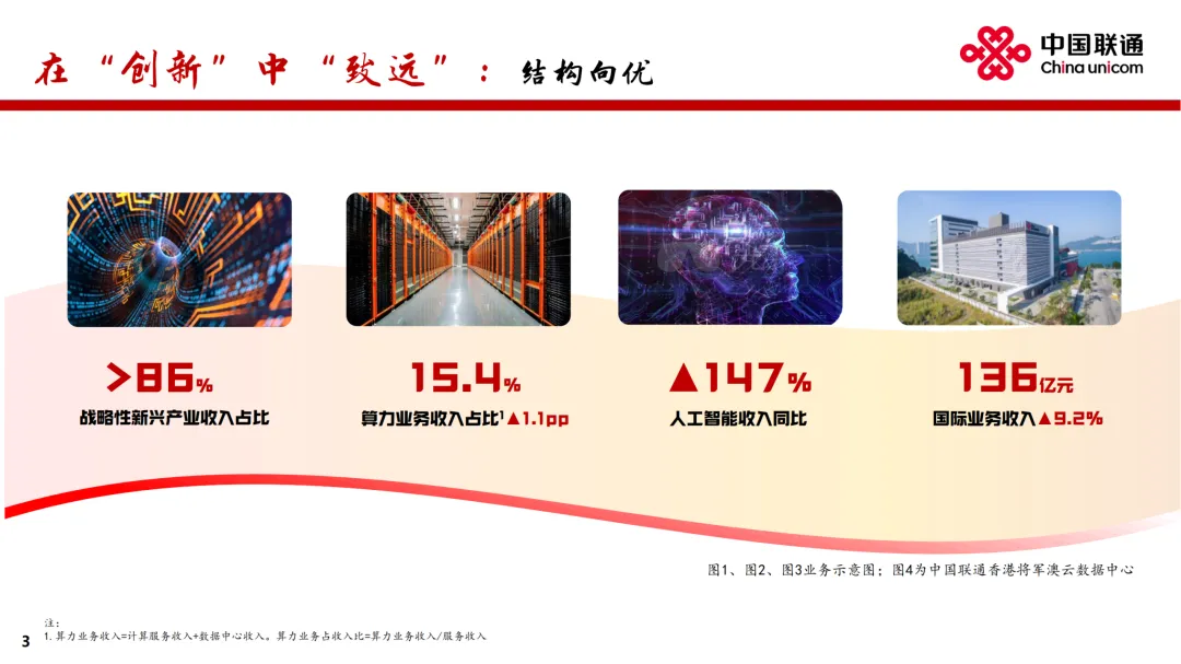 在业绩发布会上,中国联通董事长董昕用“稳定器”“推进器”“加速器”“护航器”分别形容“连接、算力、服务、安全”四大核心赛道。董昕表示,连接、算力、服务和安全,既是中国联通的优势所在和主责主业,也是代表了互联网发展的未来。中国联通30余年的发展,从弱到强,从小到大,始终有明确、清晰的战略,并且聚焦战略确立非常明确的工作措施和赛道,在此基础上坚决地落实才有了今天的成绩。联通的目标就是,健康地、鲜活地活着。增强网络能力,落实“信号升格”“宽带升级”,做好共建共享和共维共优,移动网络人口覆盖率超过99%,5G-A基站部署超过330个城市。推进千兆宽带扩容和万兆宽带升级,在100多个城市试点商用万兆光网。布局6G、量子通信等前沿领域,推出量子安全专线。拓展连接场景,用户总量突破12亿,较上年增长1.1亿,其中移动和宽带用户净增超过 2,000 万户,融合业务渗透率超过78%、融合套餐ARPU保持人民币百元以上。加速场景化转型,物联网规模突破7亿,车联网市场巩固领先优势,5G专网收入同比增长超过50%。把握低空经济机遇,打造通感导算一体的低空智联网。获得卫星移动通信业务经营许可,推动手机直连卫星规模应用。公司致力提供更快更准的算力服务,于 “东数西算” 枢纽节点和绿色算电协同示范省加强资源布局,标准机架规模超过110万架,建成 7 个百兆瓦级 AIDC 园区,智算规模达到45 EFLOPS。加快建设新 “八纵八横” 骨干光缆网,新增超过9,000公里,以实现算力枢纽节点的互联互通。数据中心收入人民币281亿元,收入同比增长8.5%。联通云加快向AI云演进,深化超大规模智能云原生实践,提升统一编排调度能力,构建 “应用+模型+资源” 的算力经营新模式,服务180多个省市政务云建设及近40万企业客户的数智转型,联通云收入同比增长5.2%。建设国家人工智能应用中试基地,推出“万象”数据工程平台、“元景”MaaS 平台、“万悟”智能体平台,积累超过 400TB 高质量数据集,提供 140多种业界主流模型,汇聚万余名开发者,助力广大客户快速构建智能体应用。人工智能收入同比增长147%。公司致力推进5G、AI等数字技术融合创新,打造差异化产品。在公众市场,透过打造家庭智能中枢 “智家通通” ,持续提升数智生活新体验,云智产品服务3亿多用户,收入同比增长超过11%。在政企市场,深度服务新型工业化与数字政府建设。升级 “5G+工业互联网” 产品体系,格物工业互联网平台连续入选国家A级双跨平台。加强车联网一体化营运,服务超过9,500万车辆。在数字政府领域,推出经济运行大模型、智能热线、 “基层通” 平台等重点产品,助力政府经济调节、政务服务、基层治理水平提升。保安全:成为全国首家且唯一通过DSMM最高级评价企业公司致力构筑更牢更强的安全防护体系。推进安全 AI 化和 AI 安全化,实现人工智能与数据安全的深度融合,成为首个且唯一通过国家数据安全能力成熟度模型(DSMM)最高等级认证的企业。构建以 “墨攻” 安全运营服务平台为核心的网络安全产品体系,提供定制化解决方案,打造安全业务增长极。推出联通安全管家产品,服务2.1亿用户。在实现经营业绩稳健增长的同时,致力于和股东分享公司发展红利。董事会建议派发末期股息每股人民币0.0523元,连同已派发的中期股息每股人民币0.1112元,2025年股息合计每股人民币0.1635元,同比提升3.5%。一阖一辟谓之变,往来不穷谓之通。2026 年,公司将不忘初心、牢记使命,把握“守正创新、行稳致远”主基调,聚焦“连接”“算力”“服务”“安全”核心赛道,走差异化道路,推动公司高质量发展取得新成效,为股东、客户和社会创造更大价值。