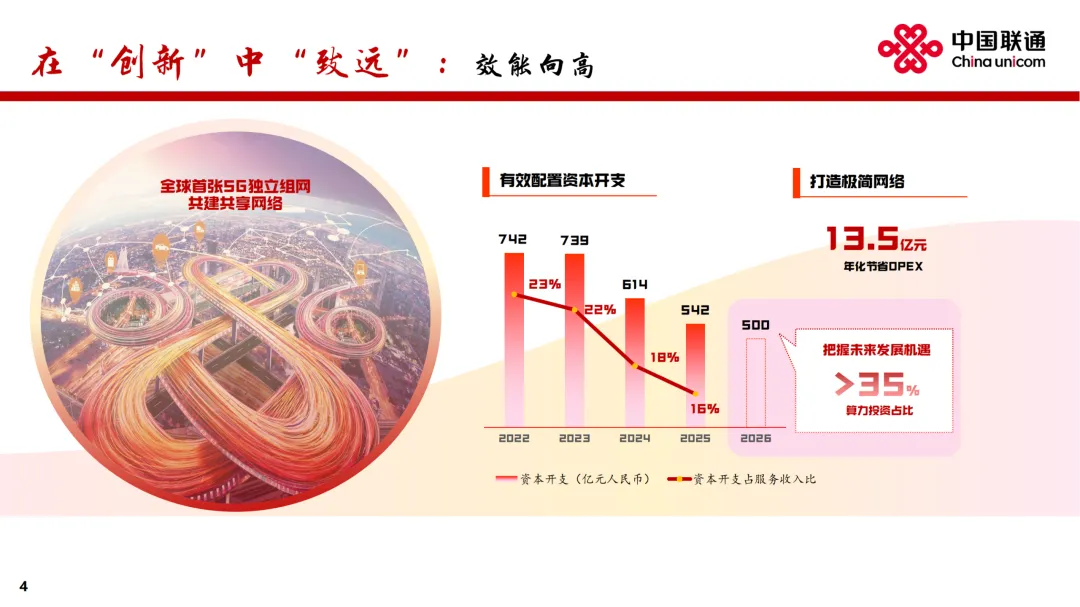 在“守正”中“行稳”,在“创新”中“致远”。中国联通聚焦“连接”“算力”“服务”“安全”四大核心赛道,高质量发展迈出坚实步伐。2025年,营业收入3922亿元,利润总额253亿元,净资产收益率5.39%,自由现金流373亿元、同比增长24.7%。