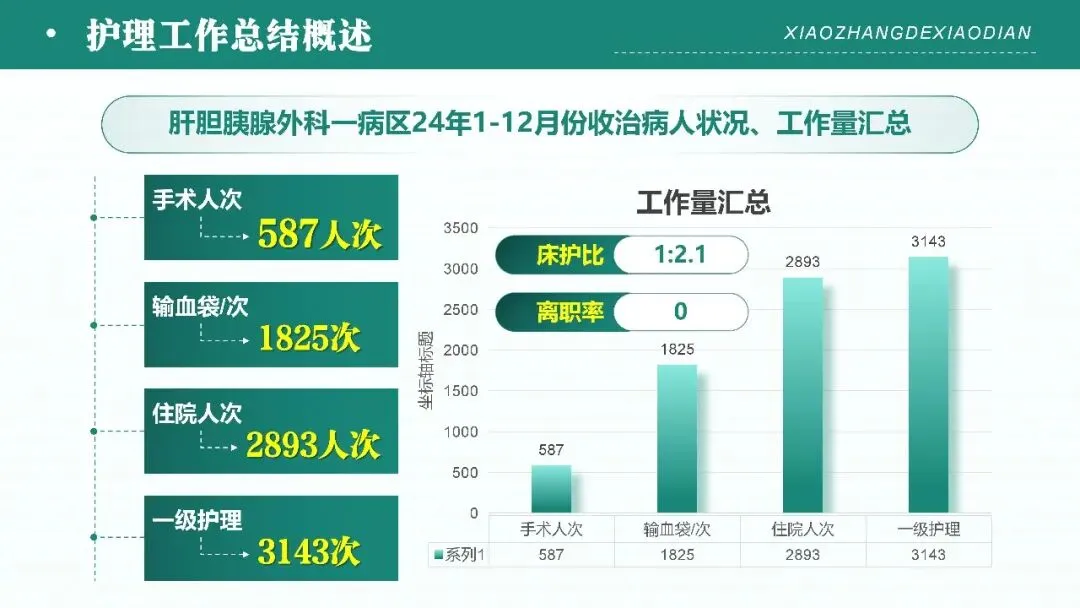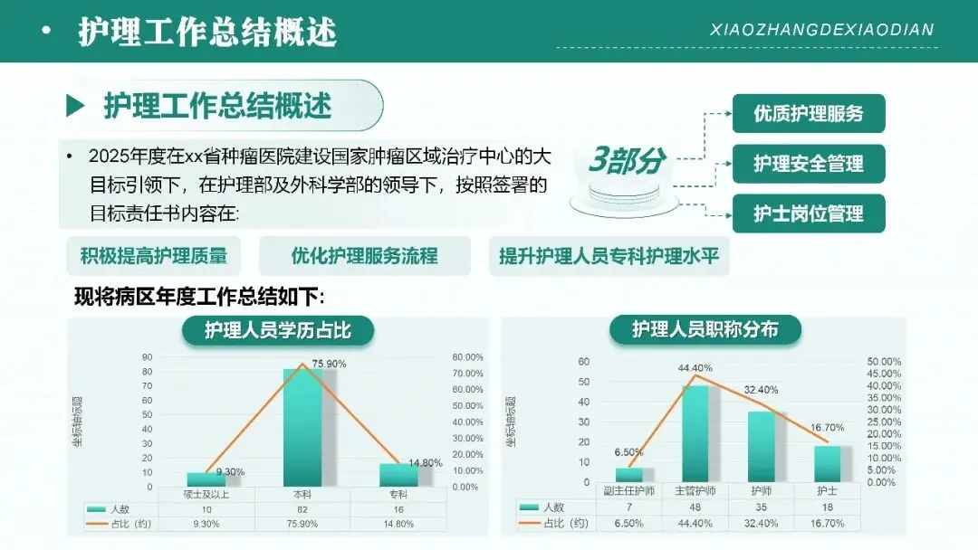 - 护理工作总结概述:锚定医院建设发展整体目标,以优质护理服务、护理安全管理、护士岗位管理为三大核心方向,介绍病区护理团队的学历、职称分布,及过往住院、手术等核心工作数据、床护比、团队稳定性等基础情况,明晰年度护理工作的整体开展背景与核心抓手。