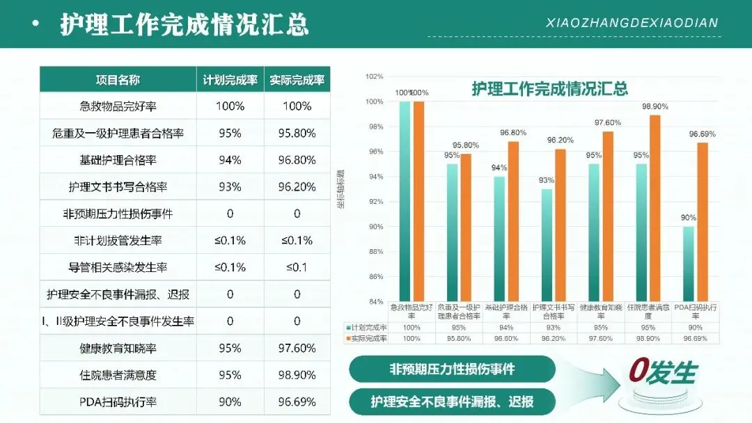 - 护理工作完成情况汇总:通过计划与实际完成率的直观对比,全面呈现急救物品管理、护理质量达标、护理安全管控、健康宣教、患者满意度、流程执行等各项核心指标达成情况,所有指标均达标且多数超额完成,无重大护理安全不良事件发生,充分展示年度护理工作实绩。