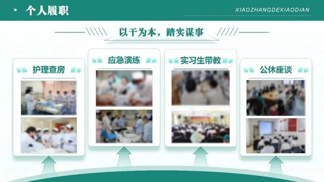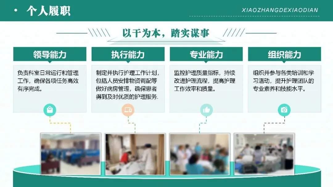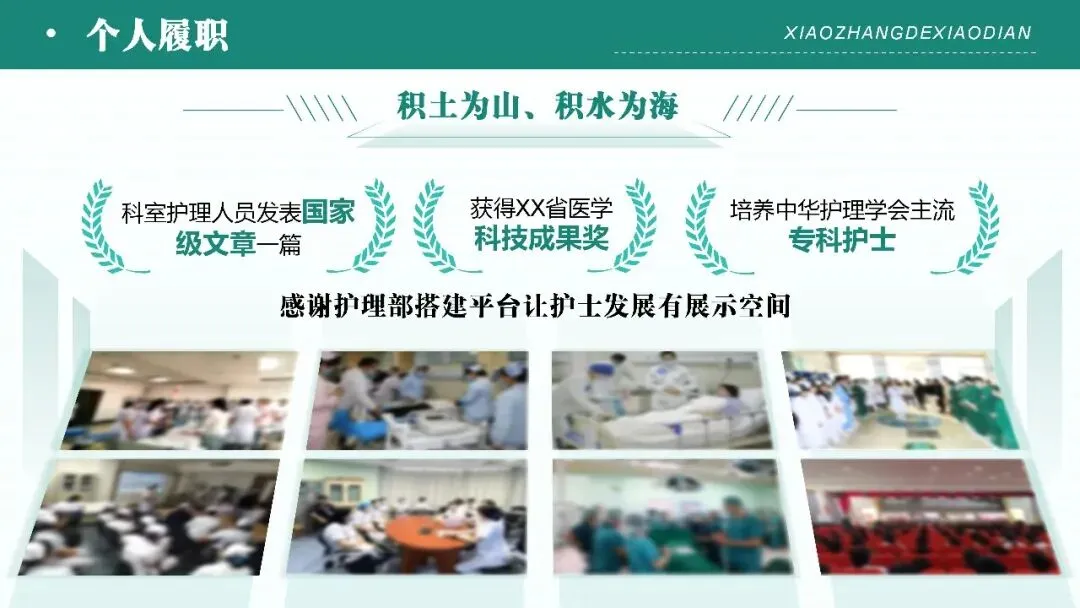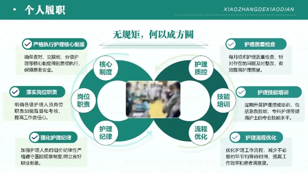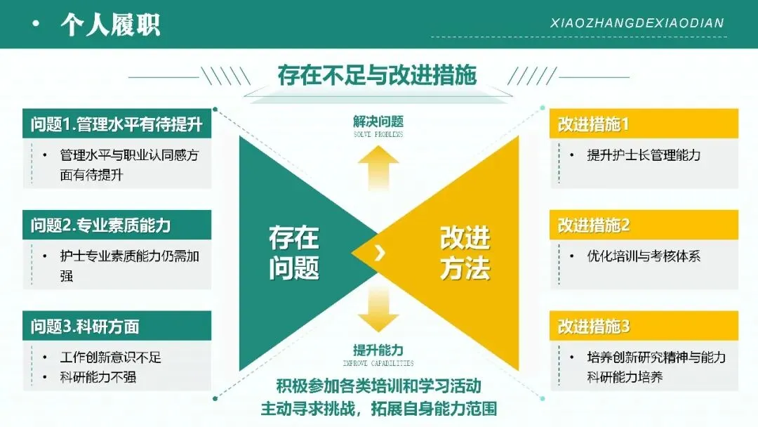 - 个人履职:从制度落地、日常工作、成果亮点、问题改进四方面展开,涵盖护理核心制度执行、岗位职责落实、质控检查、技能培训、流程优化等基础工作,及公休座谈、实习生带教、应急演练等专项工作;同步展示科室科研、专科护士培养等成果,直面管理水平、专业素质、科研创新等方面的不足,并提出针对性改进措施。