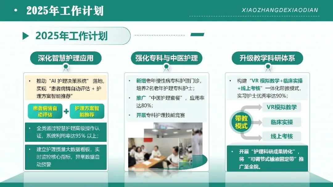 - 2025 年工作计划展望:结合年度工作基础与现存问题,从深化智慧护理应用、强化专科与中医护理、升级教学科研体系三大维度,制定具体的工作目标与落地举措,明确下一年度护理工作的发展方向与重点任务。