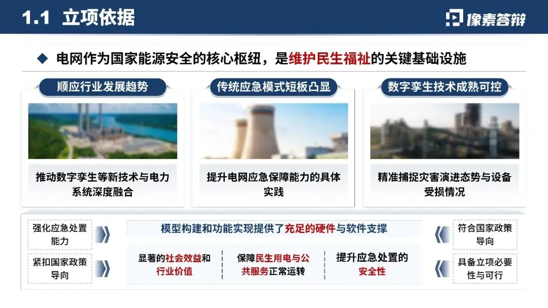 本项目紧扣国家 “双碳” 与智慧城市战略,技术路径清晰、创新亮点突出、落地前景广阔,既解决电网应急领域的实际痛点,又符合数字经济发展方向,是能源电力与数字技术融合的典型示范项目,具备极高的立项与推广价值。