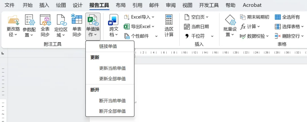当一份Word报告链接多个Excel单元格时,数据同步与源链接修改一直是两大核心痛点。报告工具的“单值操作”模块全新升级,集成链接单值、更新单值、断开单值、更改单值路径四大功能,轻松实现Word与Excel的无缝交互。链接的Excel单元格数据,可保持Word当前位置的格式(如字体、字号、颜色等)