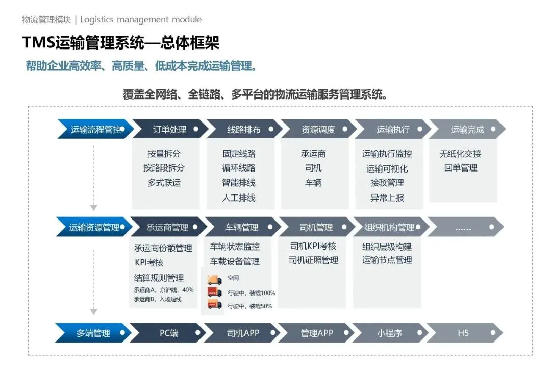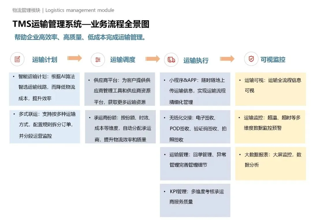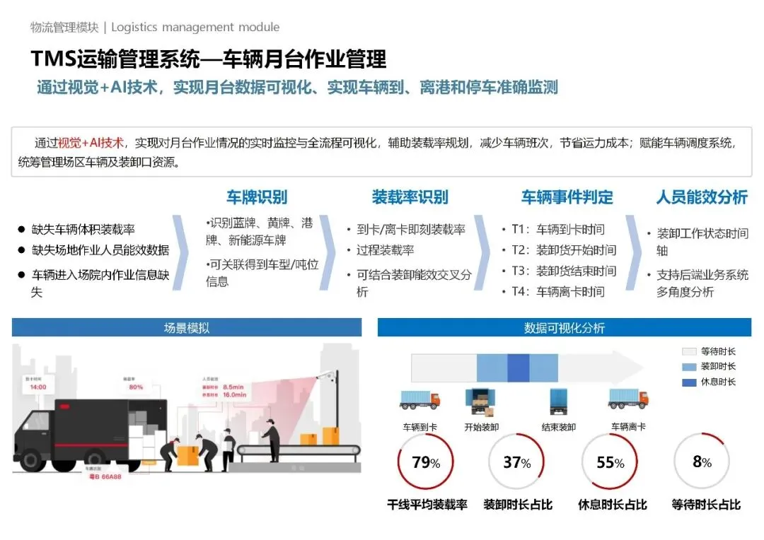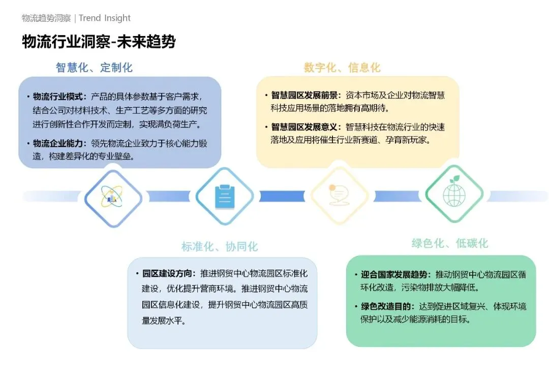 四是管理集约化,通过智能调度优化运力配置、仓储布局与货物流转路径,降低土地、人力、能耗等资源消耗,同时兼顾绿色低碳与安全管控,契合现代物流可持续发展要求。