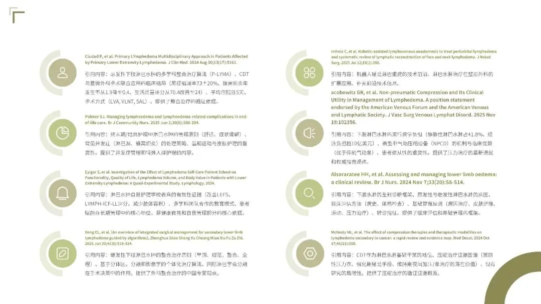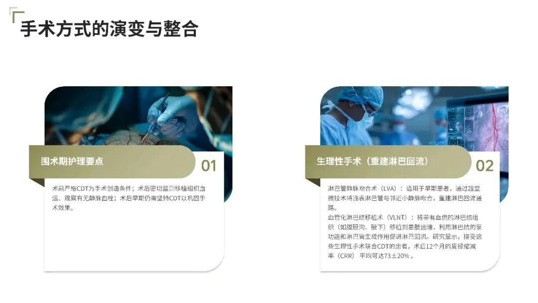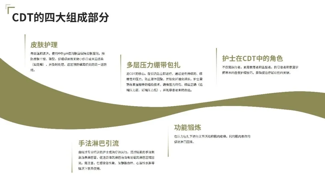 其次是评估与实操维度,拆解标准化护理评估体系,聚焦综合消肿治疗 CDT、手术围术期护理的核心实操要点,把 “怎么评、怎么做” 讲透,方便临床直接落地执行。