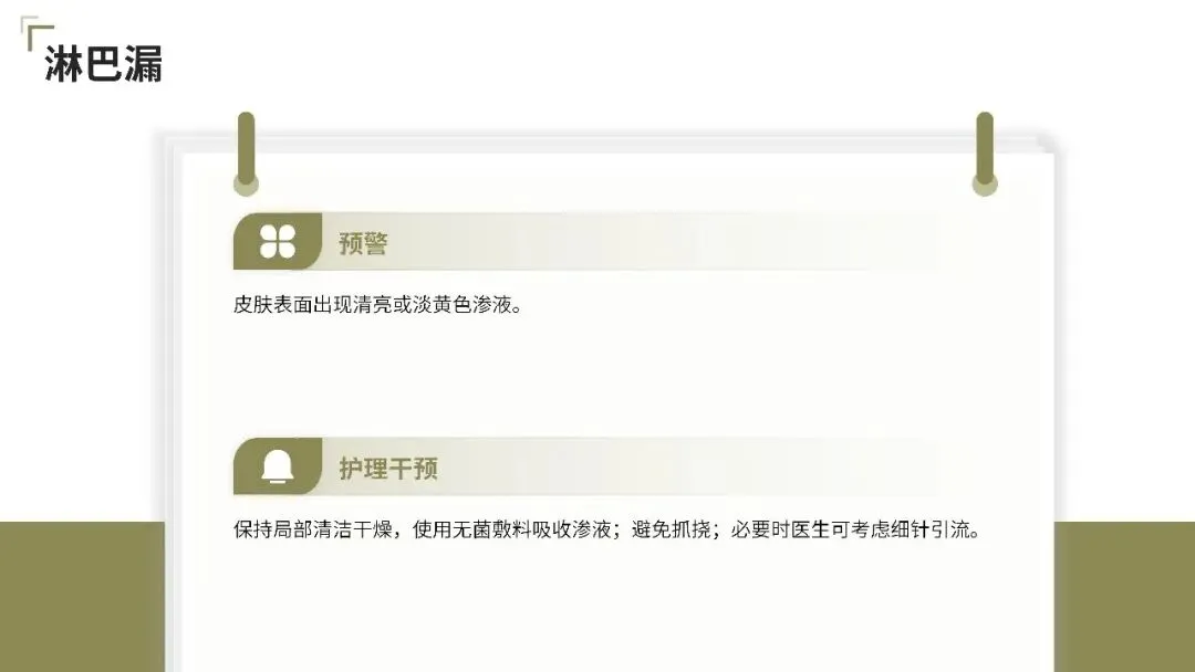 然后是风险防控维度,梳理蜂窝织炎、淋巴漏等常见并发症的预警、预防与应急处置规范,明确操作禁忌症,划清临床安全红线,规避护理风险。