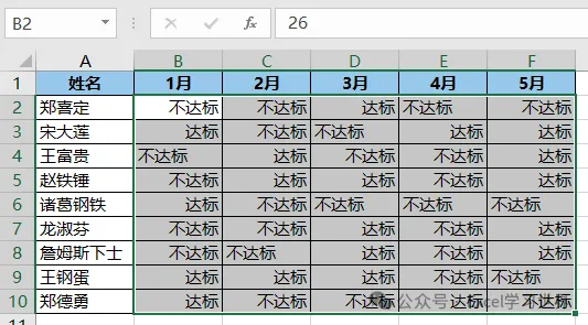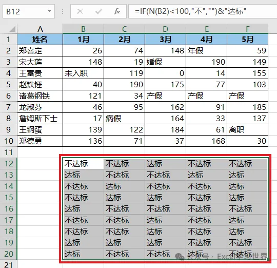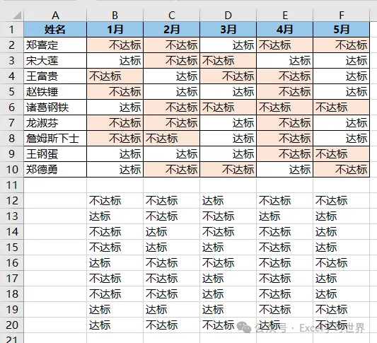 将下图 1 中所有 <100 的数值和文本单元格都转化成“不达标”,其余为“达标”,并且将“不达标”的所有单元格都高亮显示。