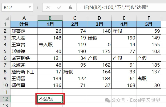 ...&"达标":将上述结果与“达标”连接起来,即可达到题目要求