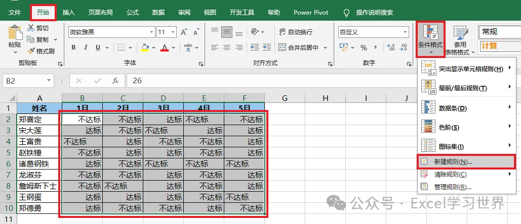 4. 保持选中上述区域 --> 选择工具栏的“开始”-->“条件格式”-->“新建规则”