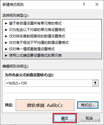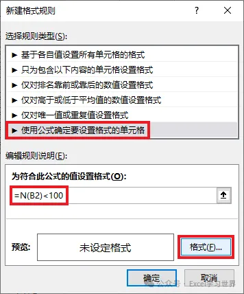 5. 在弹出的对话框中选择“使用公式确定要设置格式的单元格”--> 输入以下公式 --> 点击“格式”按钮: