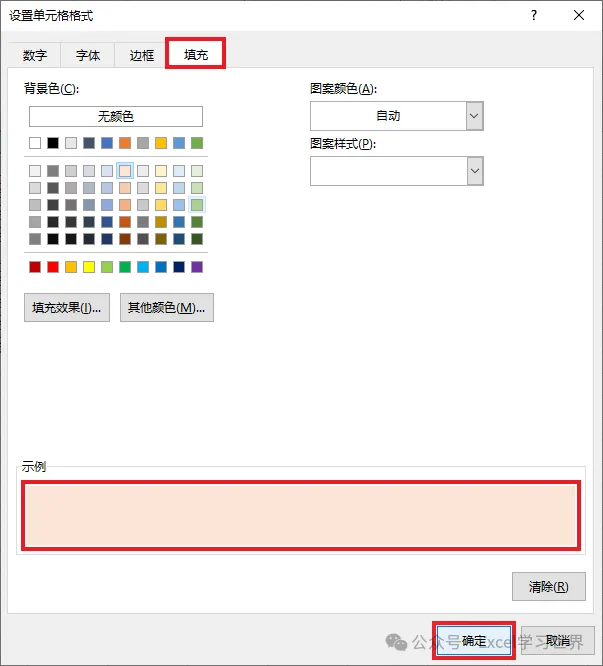6. 在弹出的对话框中选择“填充”选项卡 --> 选择所需的填充色 --> 点击“确定”
